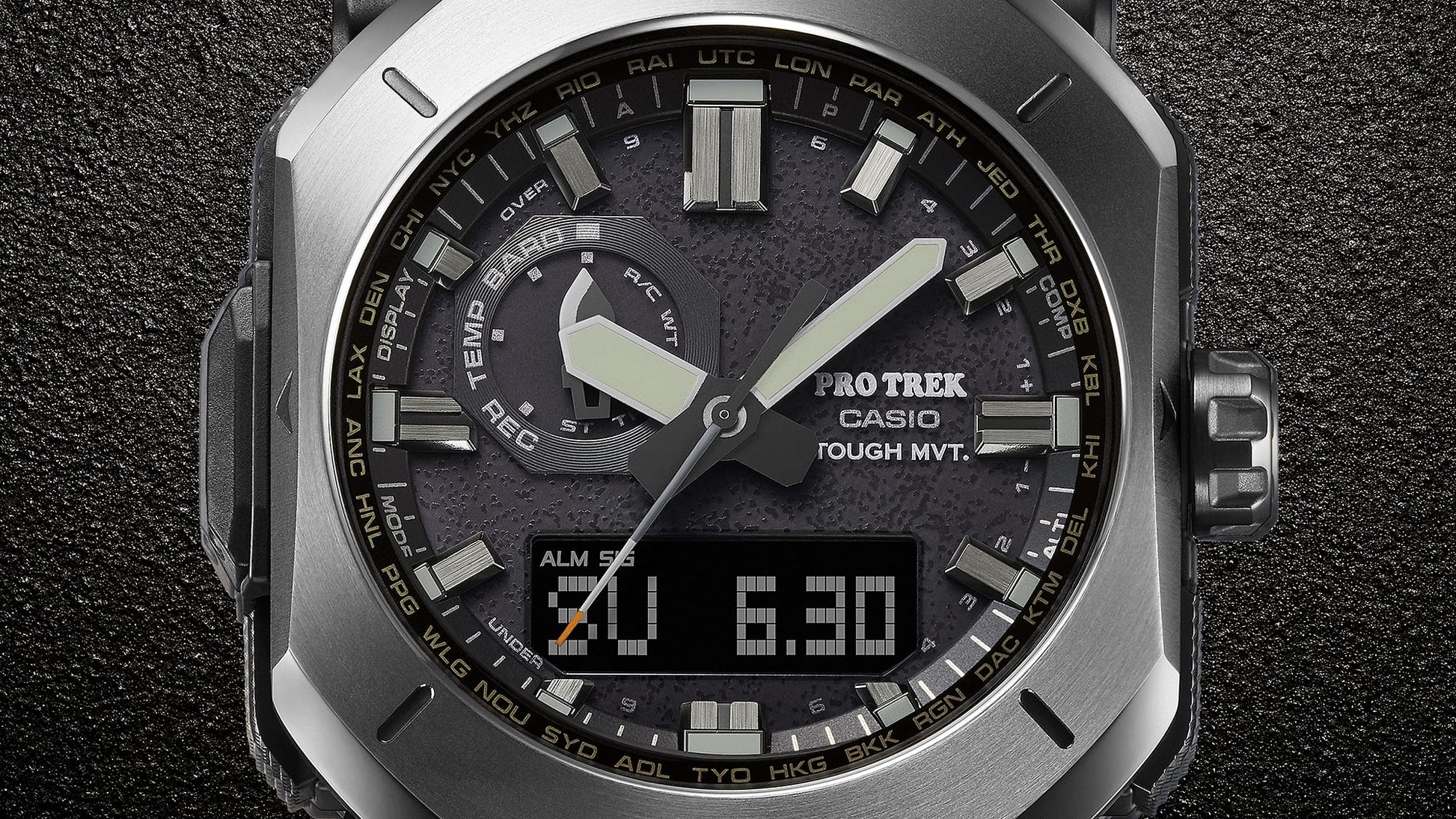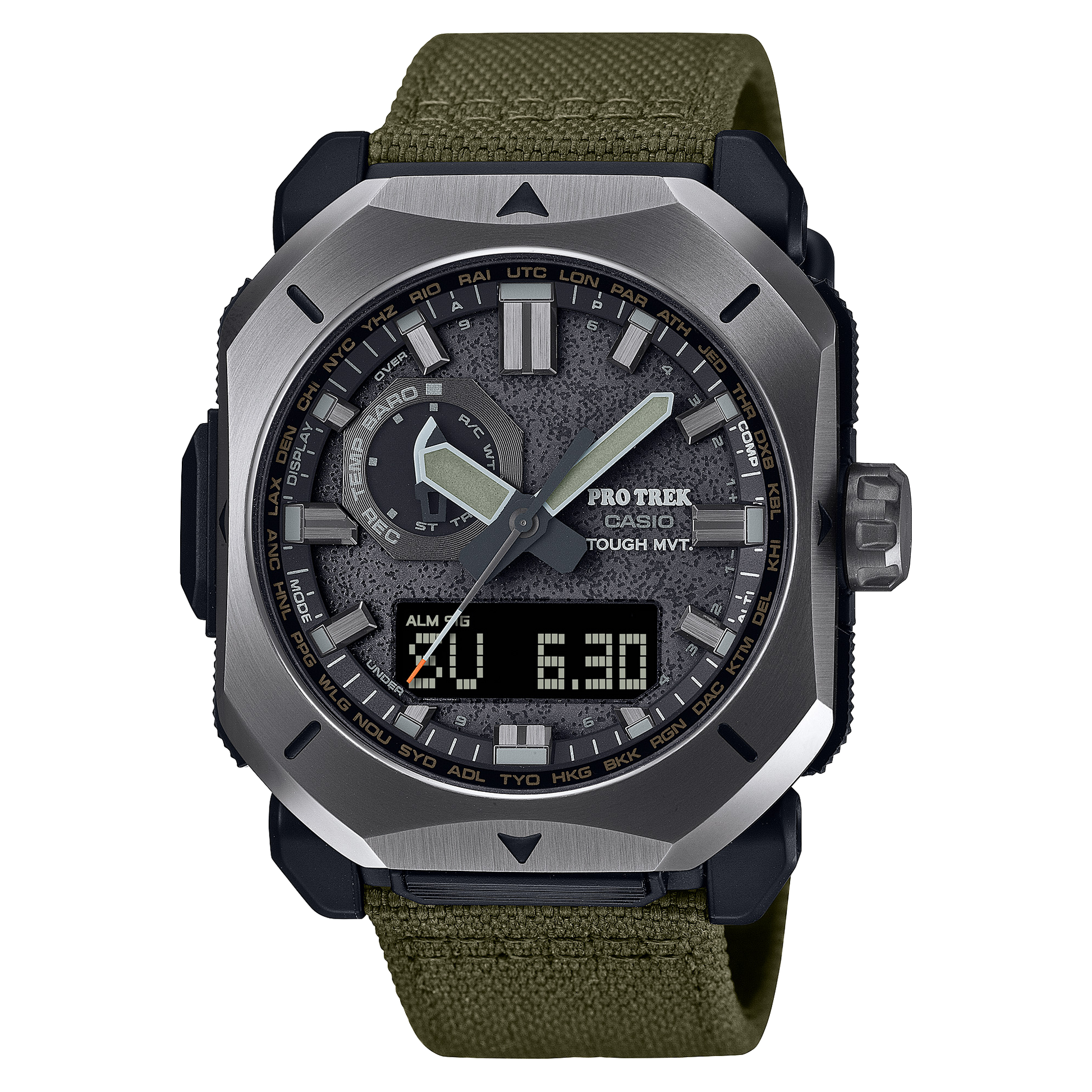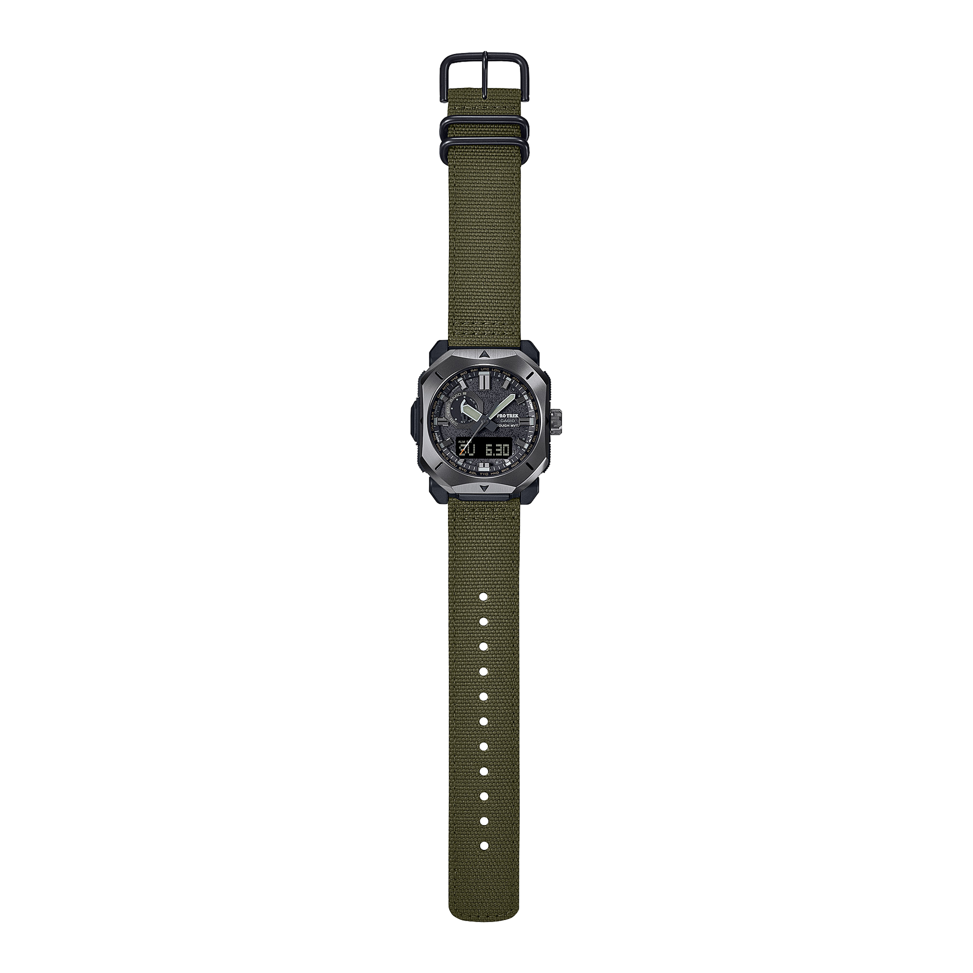 For the adventurer who understands all there is to love about the world of bushcraft — the PRW6900YB with CORDURA re/corTM* band. Make the most of your camping trips and cozy up to the fire. The band is made of CORDURA re/corTM* textile treated with flame retardant to resist burn marks and free you from worry around sparks from cooking or campfires. In a rough and rugged outdoor style, this timepiece features a solid octagonal metal case, metal bezel with sharply tapered edges reminiscent of a wood axe, and an inset dial indicator hand shaped like the blade of a camping knife. The orange accent on the seconds hand evokes the glowing embers of a campfire. The dial surface is forged for a texture reminiscent of that campfire cookware classic, the Dutch oven. With a band in camping-gear khaki and case design with a powerful presence, this is a watch that easily takes you from wild outdoor adventures to fashionable urban streets. *CORDURA® is an INVISTA trademark for durable fabrics.
