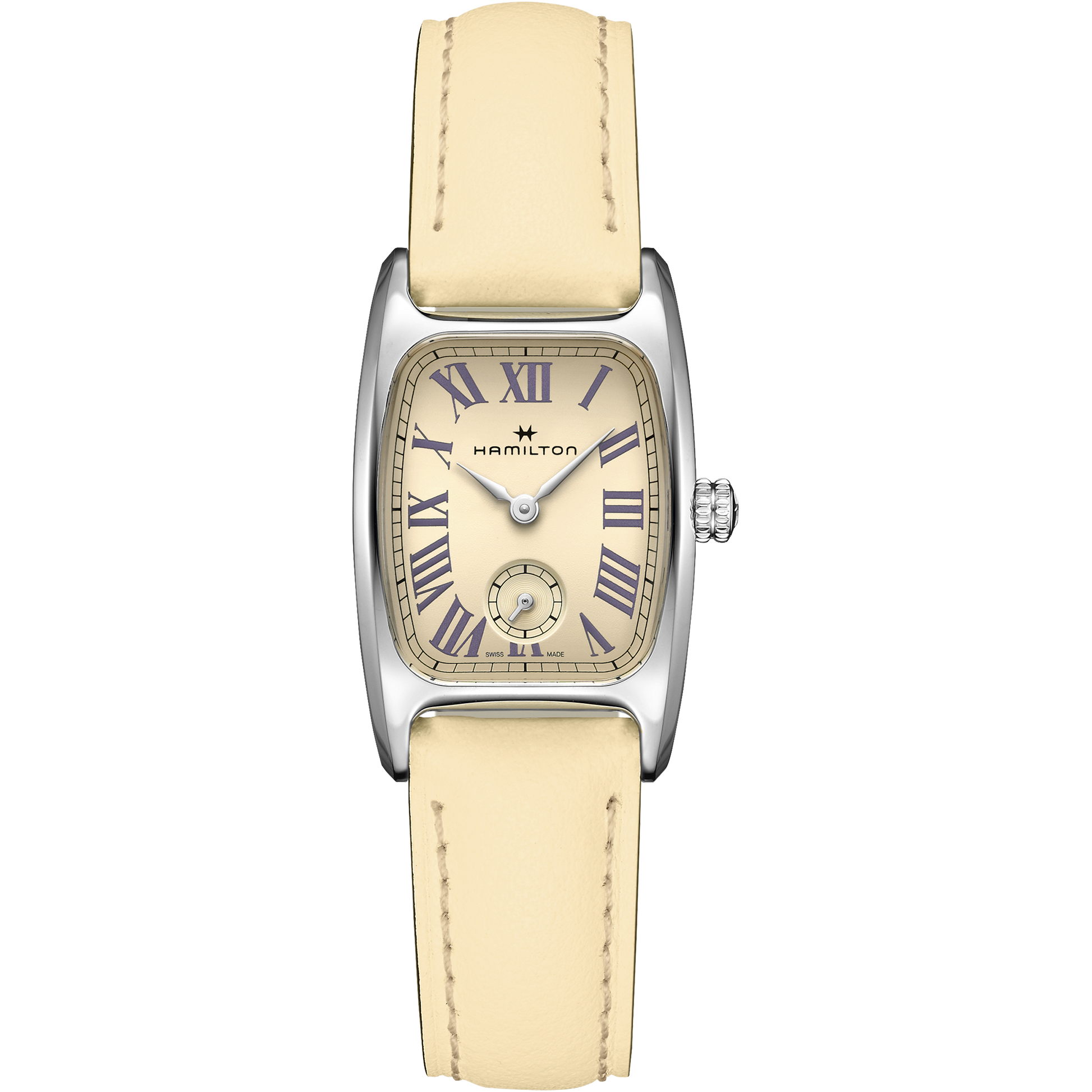 Featuring an artfully curved case shape and distinctive Art Deco design, the Hamilton Boulton M is reimagined in bold colors, inspired by classic macaron flavors. The timepiece's beautiful vanilla beige dial is enhanced with Roman numerals in lavender purple and complemented with a matching leather strap to complete the look. Exploring a palette of delicious color combinations, the Hamilton Boulton is an enticing sweet treat for the wrist. Seamlessly marrying the old and the new, this timepiece exudes feminine flair that is both fresh and timeless.