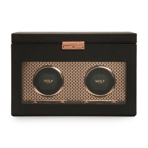 Powder-coated or copper-plated laser cut perforated steel melded with clean, sleek lines. The Axis collection drives a modern, bold look for safekeeping your timepieces. Our patented technology of counting rotations of the axis of your watch guarantees precise Turns Per Day.