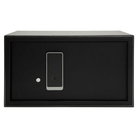 The Den safe has a vegan leather covered exterior and features four patented WOLF watch winders with storage space above including a Vault Tray with removable 3-piece watch tray. The door of The Den opens and locks with a biometric identifier or keycode.