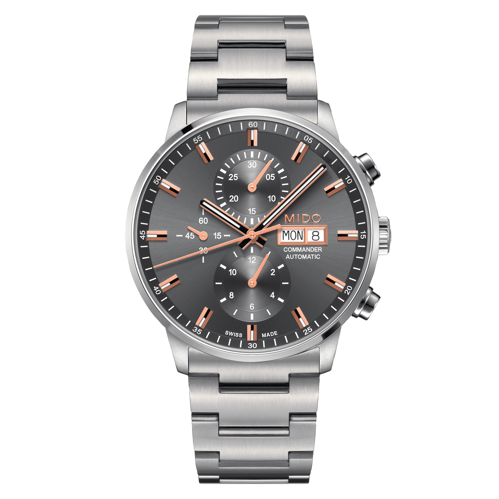 The Commander Chronograph is the largest in the Commander collection with a 42.5mm diameter.This exceptional timepiece integrates all the codes of the iconic Commander watch: sunray satin-finished dial, integrated indexes and day-date function, with an automatic chronograph movement offering a power reserve up to 60 hours.