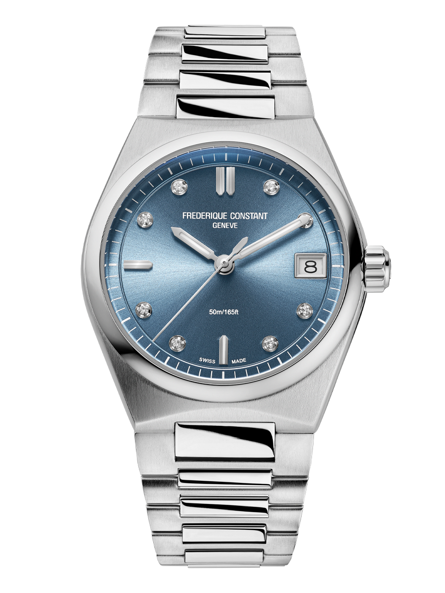 This Highlife Ladies Quartz features the integrated and interchangeable bracelet that has become the hallmark of the collection. Featuring a date window, this style has an icy blue with sunray finishing on the dial, accented by silver and diamond indexes. The frosty theme continues to the brushed and polished stainless steel 3-link bracelet. Can be customized by swapping the original bracelet for the blue rubber strap supplied with the watch.