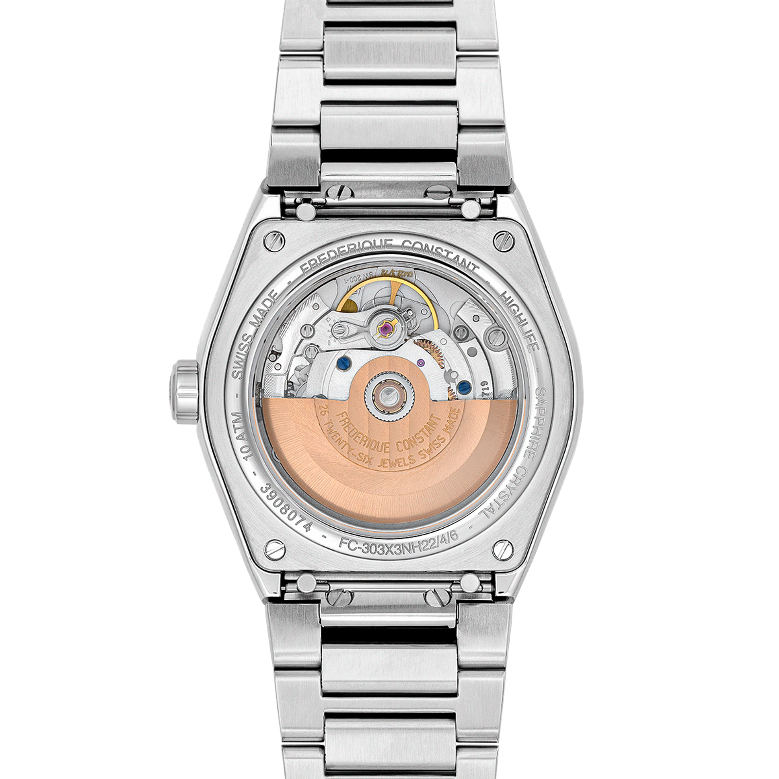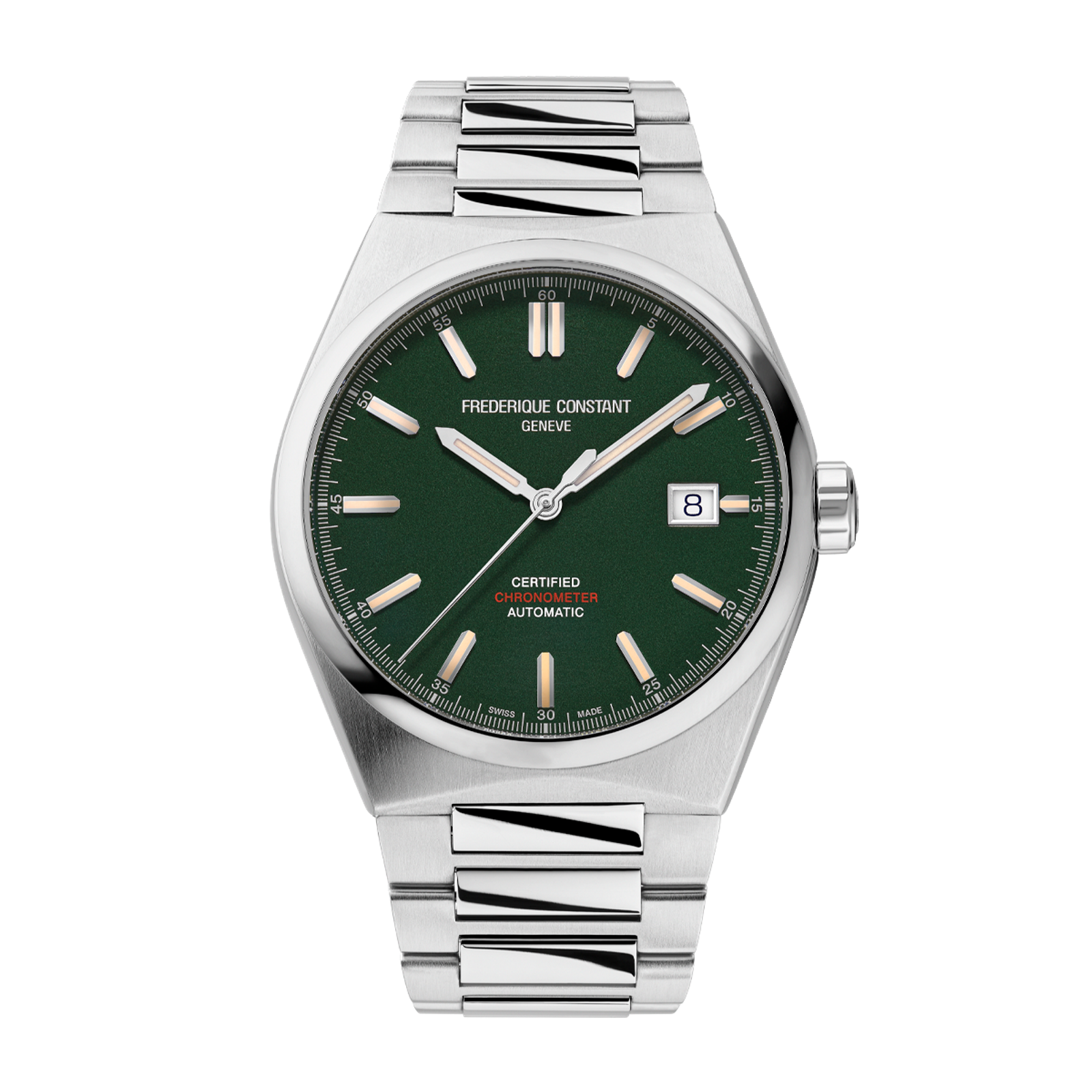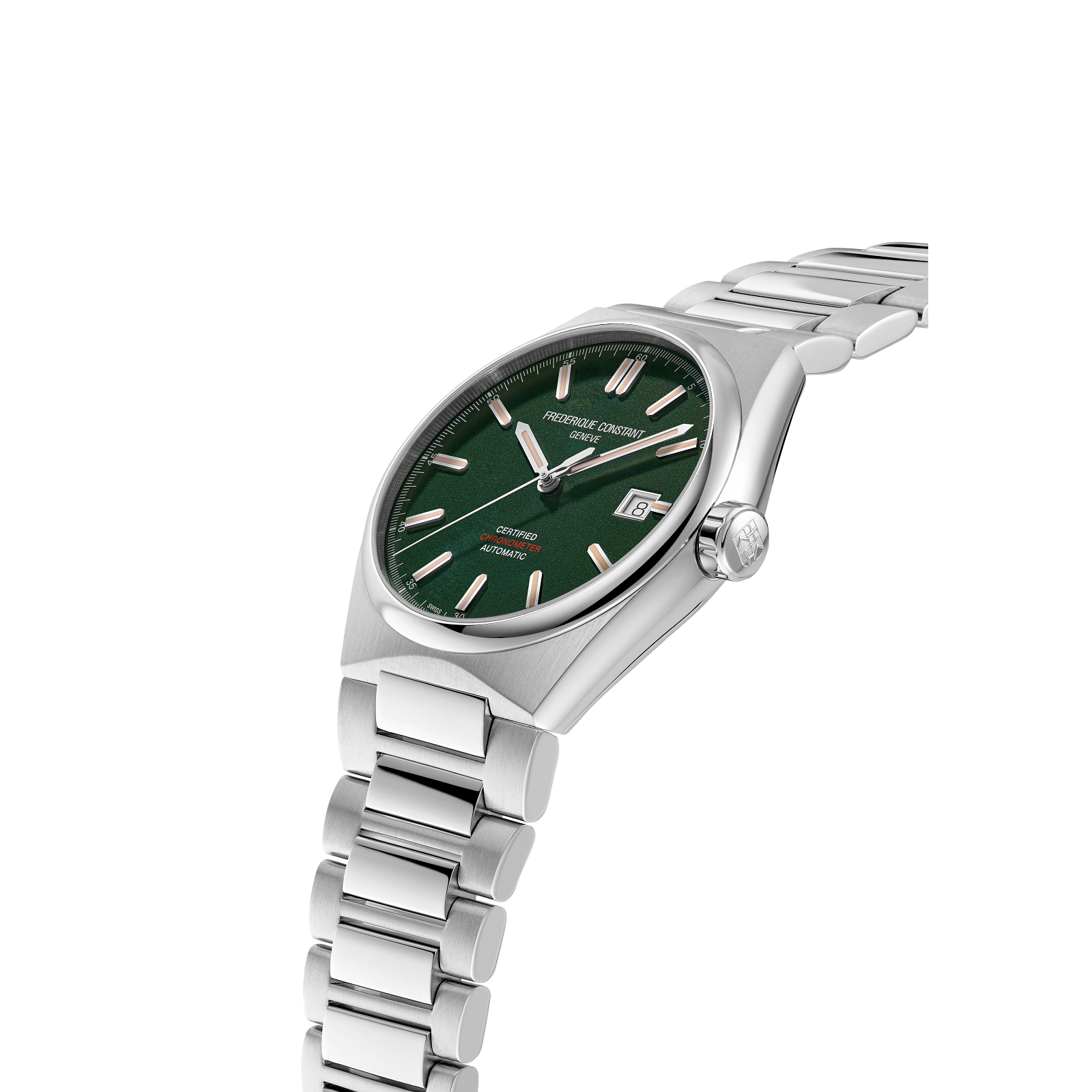 The Highlife timepieces have been designed for everyday use thanks to their modern case, integrated bracelet design and additional strap. Now available in a new unisex 39mm case size, this COSC style is set on a brushed and polished stainless steel 3-part case, with a green dial, silver tipped gold tone indexes, and hand polished hour, minute and seconds hands. Includes an additional green nubuck leather strap.