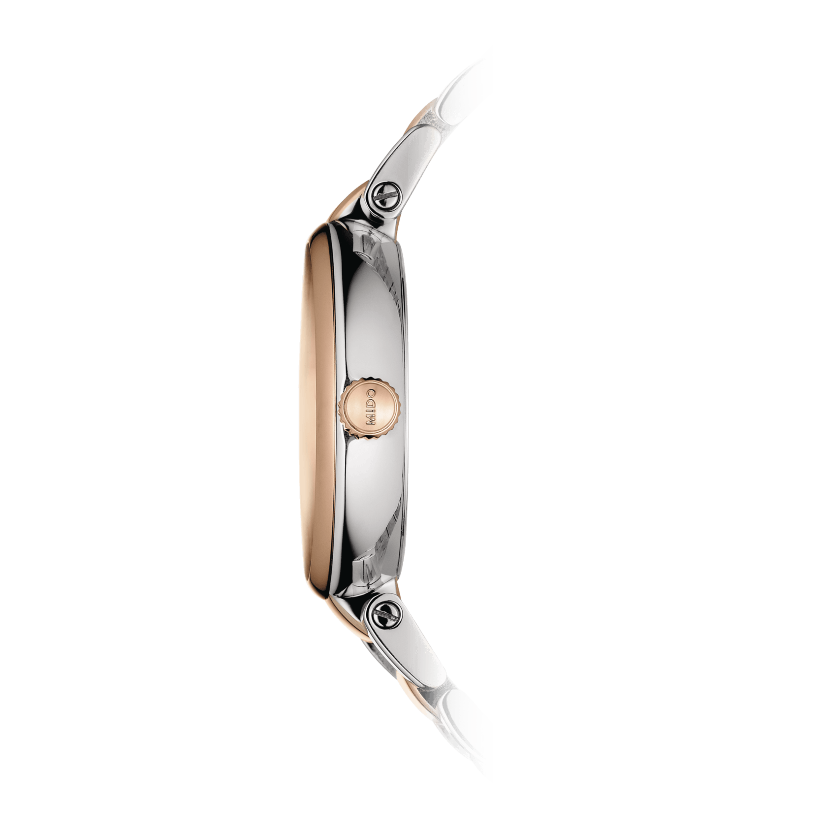 The Baroncelli Donna automatic Swiss watch is recognisable by its round shape, domed sapphire crystal, double-sided hands and specific central lug. Those elements give a pure and elegant design to this feminine and classic timepiece, equipped with an automatic movement.