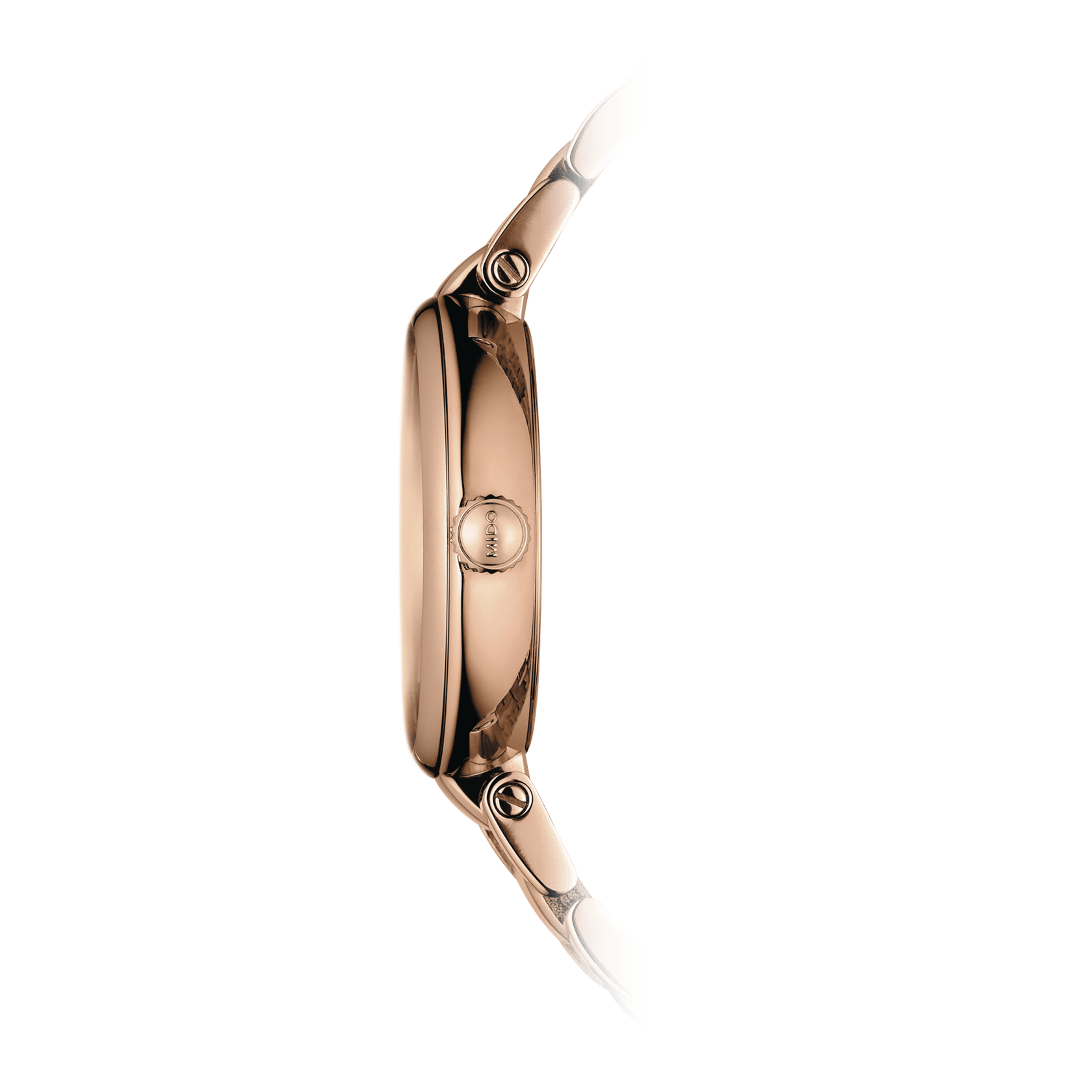 The Baroncelli Donna automatic Swiss watch is recognisable by its round shape, domed sapphire crystal, double-sided hands and specific central lug. Those elements give a pure and elegant design to this feminine and classic timepiece, equipped with an automatic movement.