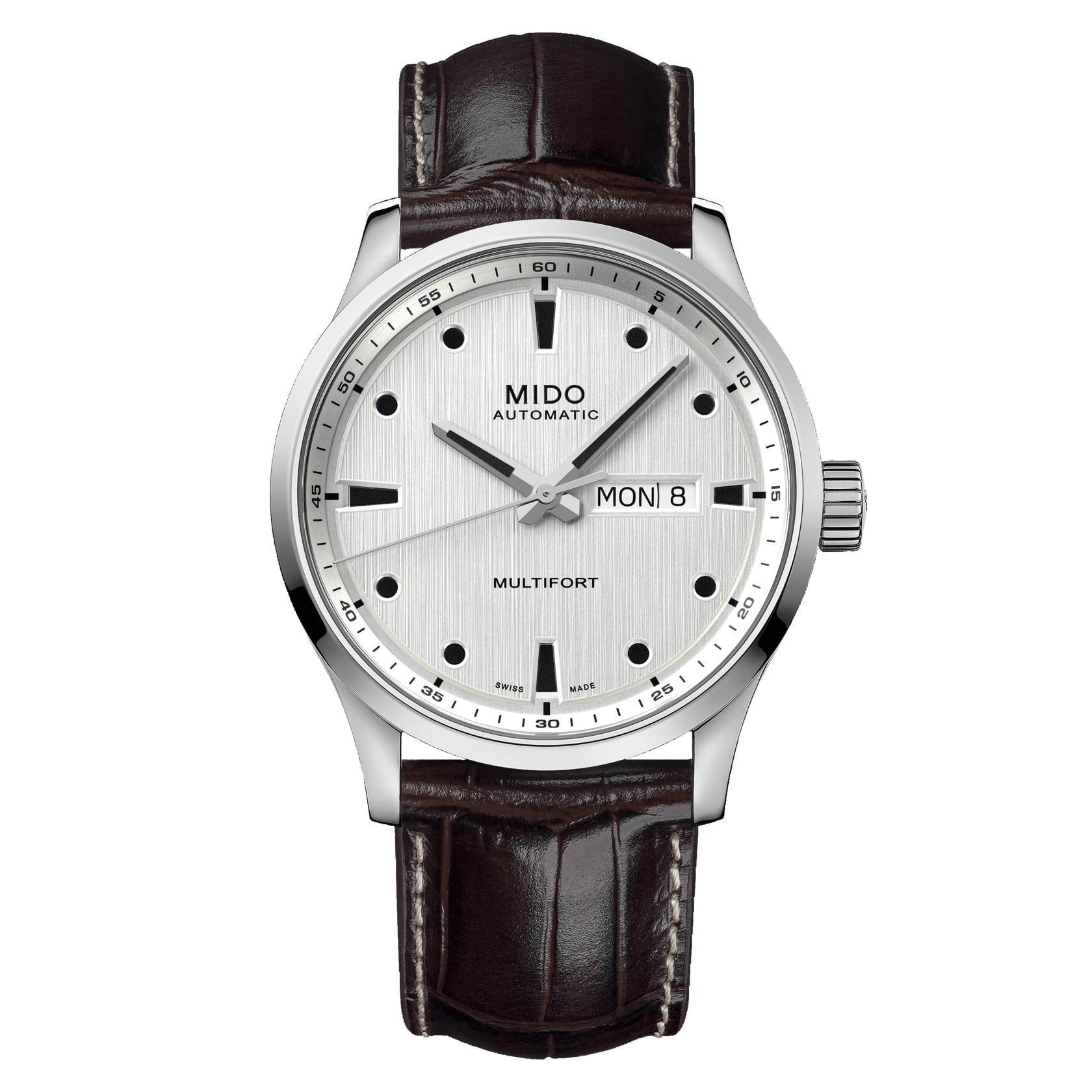 On the gradient dial of the Multifort M, a vertical satin finish recalls the Côtes de Genève characteristic of the collection. Immaculate Super-LumiNova® creates contrast and readability on the hands and round indexes. The legendary robustness of Multifort beats to the rhythm of the famous Caliber 80. Its power reserve of up to 80 hours is combined with a hairspring in Nivachron™ – a revolutionary material offering formidable precision. MIDO proposes the Multifort M with a strap change system without tools, in steel or textile version on a rubber base.