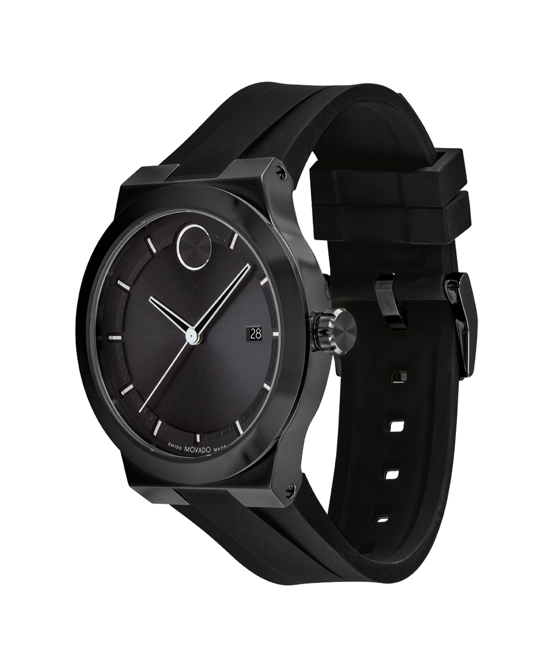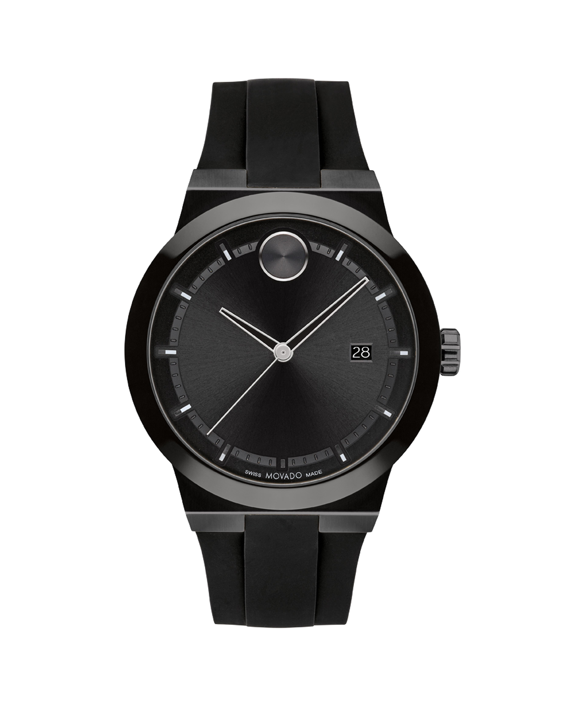 Movado BOLD Fusion, 42 mm black ion-plated stainless steel case & black ceramic bezel with a black-toned dial on black silicone strap.
