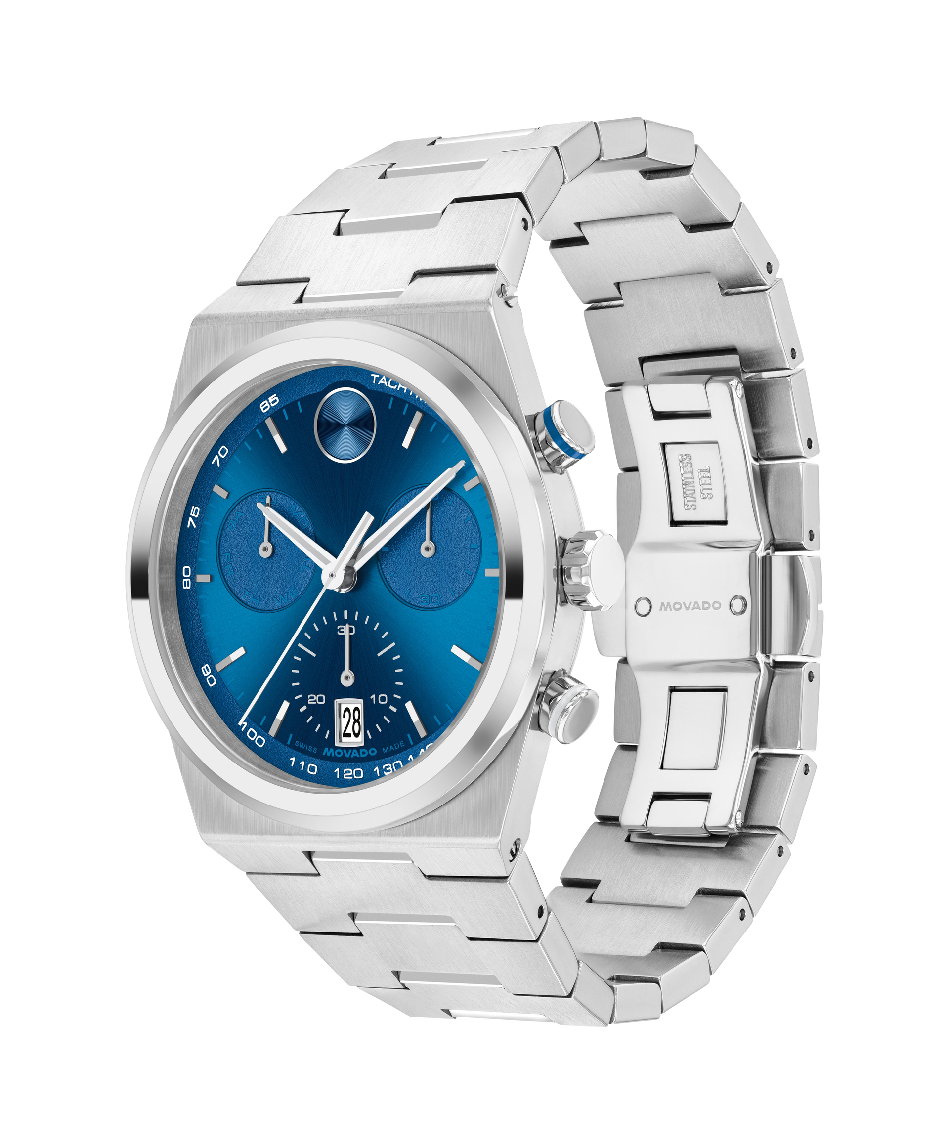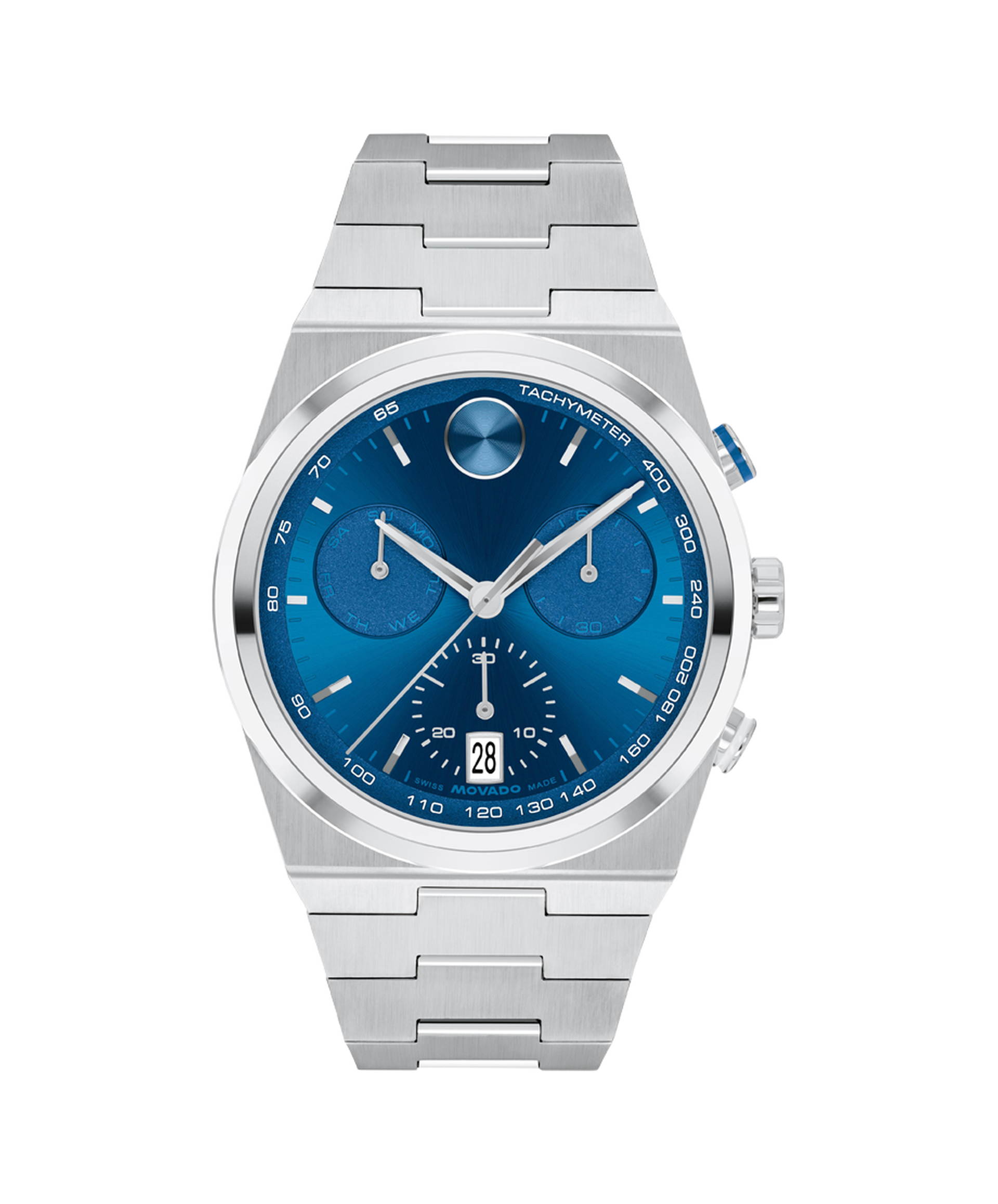 The BOLD Quest Chronograph looks to the future with a shaped case and an integrated bracelet. This 42mm chronograph features a blue dial with satin-finish subdials, stainless steel hands, and our signature dot at 12 o'clock.