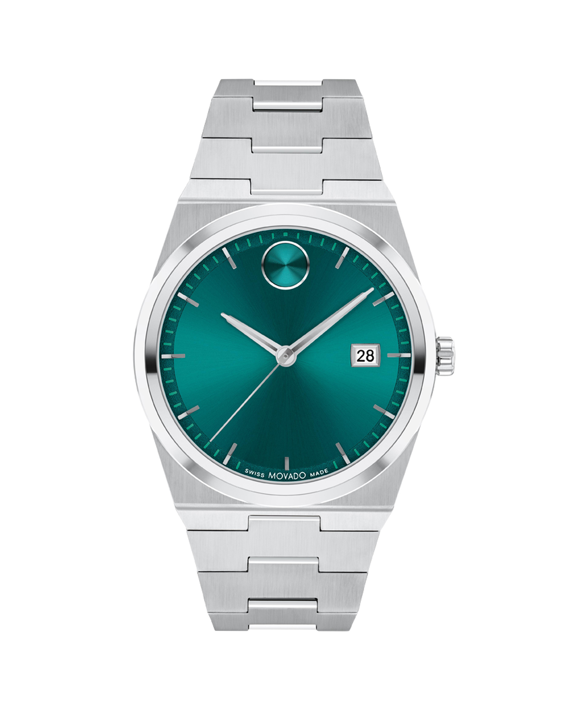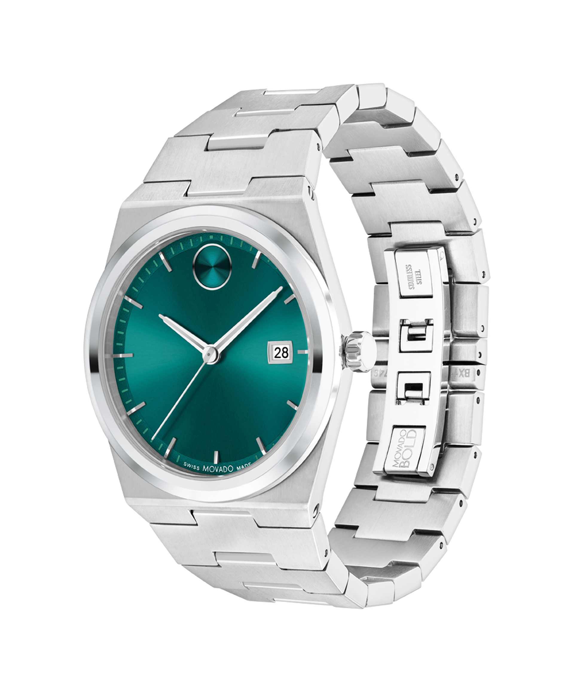 The BOLD Quest looks to the future with a shaped case and an integrated bracelet. This 40mm watch features a green sunray dial, steel hands, and our signature dot at 12 o'clock.