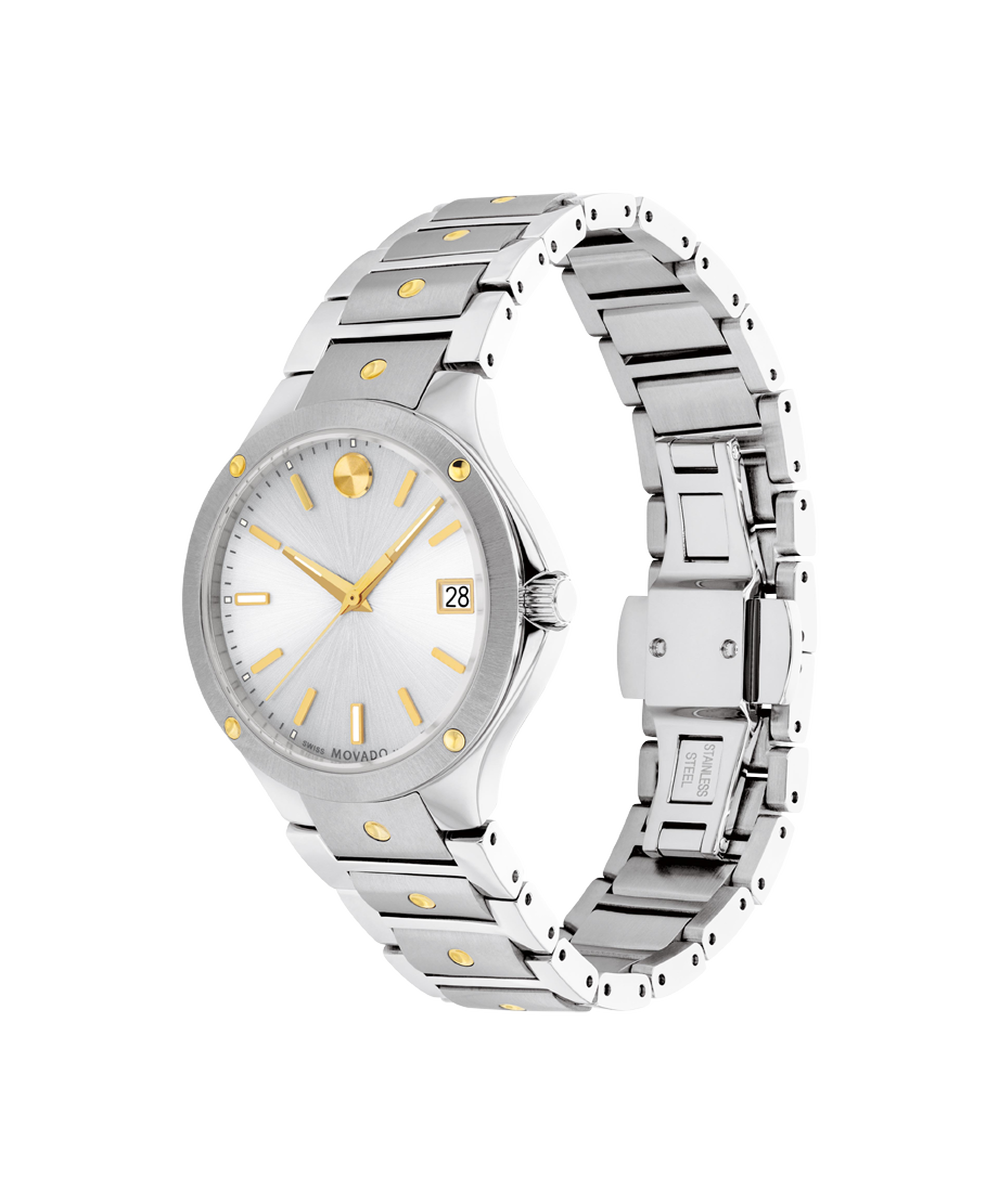 The Movado SE is defined by Swiss craftsmanship and sport-elegant design. This 32 watch features a silver white sunray dial, Swiss Super-LumiNova accents, and our signature dot motif.