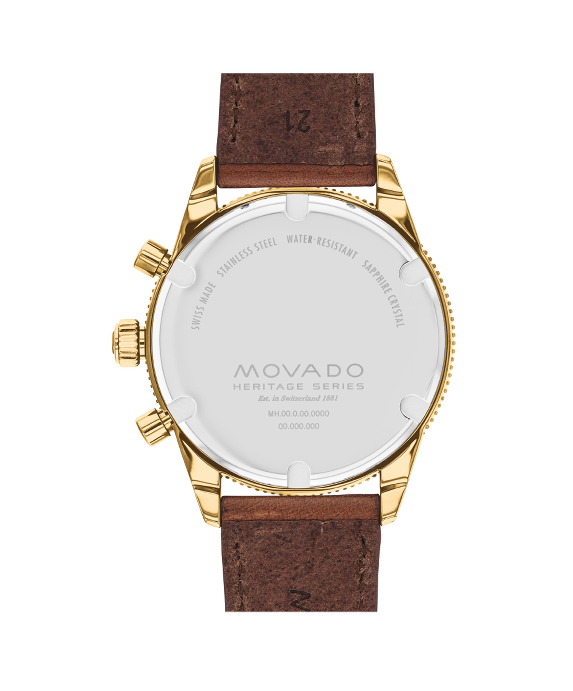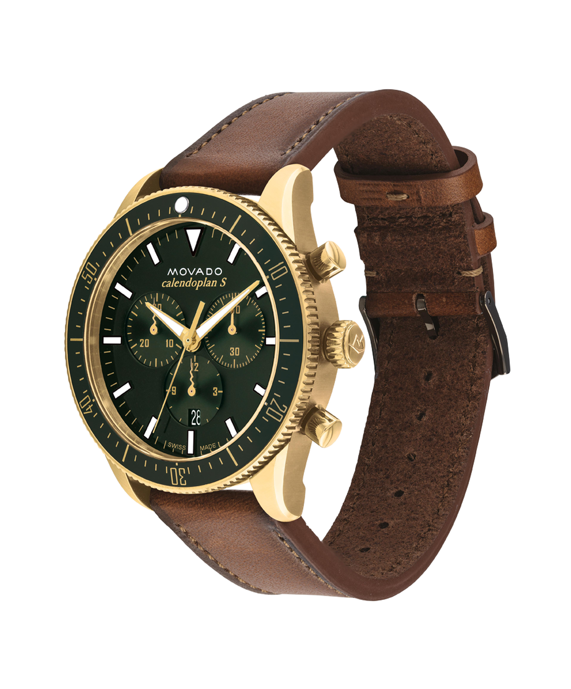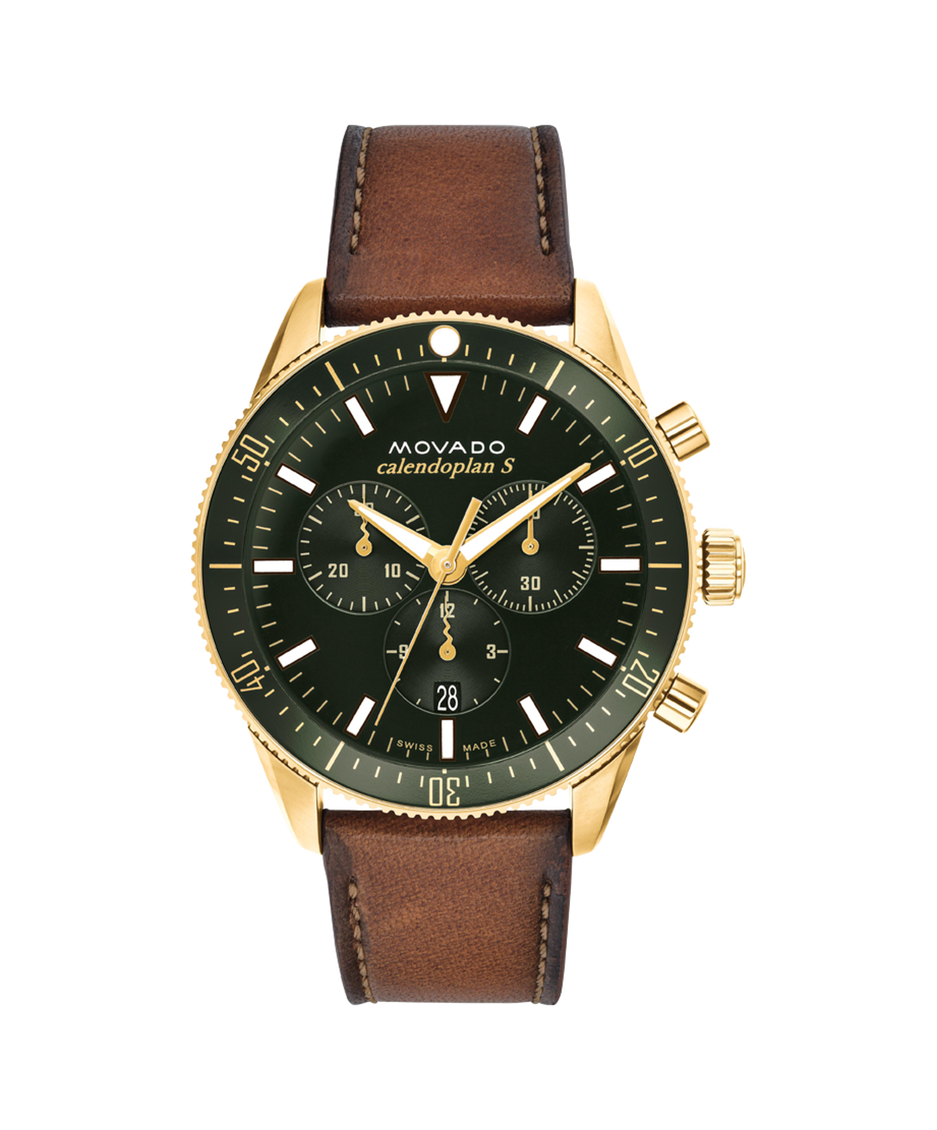 Movado Heritage Series Calendoplan S Chronograph, 42mm yellow gold-ion plated case with fluidly extended lugs, green aluminum bezel & green chronograph dial. Features Swiss Super-LumiNova® accents on cognac leather strap.