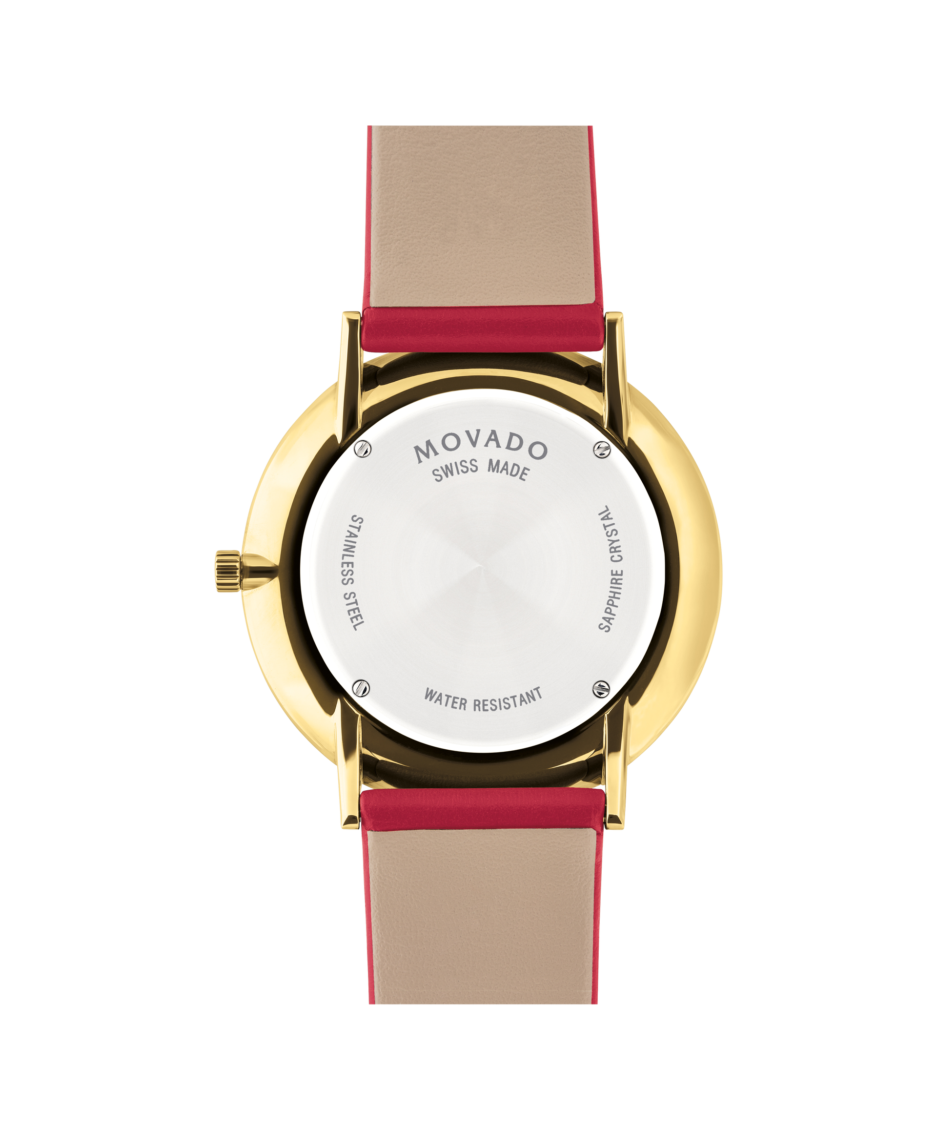 Movado Museum Dial Modern 47 watch, 40 mm yellow gold PVD-finished stainless steel case, 6.30 mm thin, with red dial and yellow gold-toned original flat dot and stick hands, red calfskin strap with yellow gold PVD-finished stainless steel classic tongue buckle.