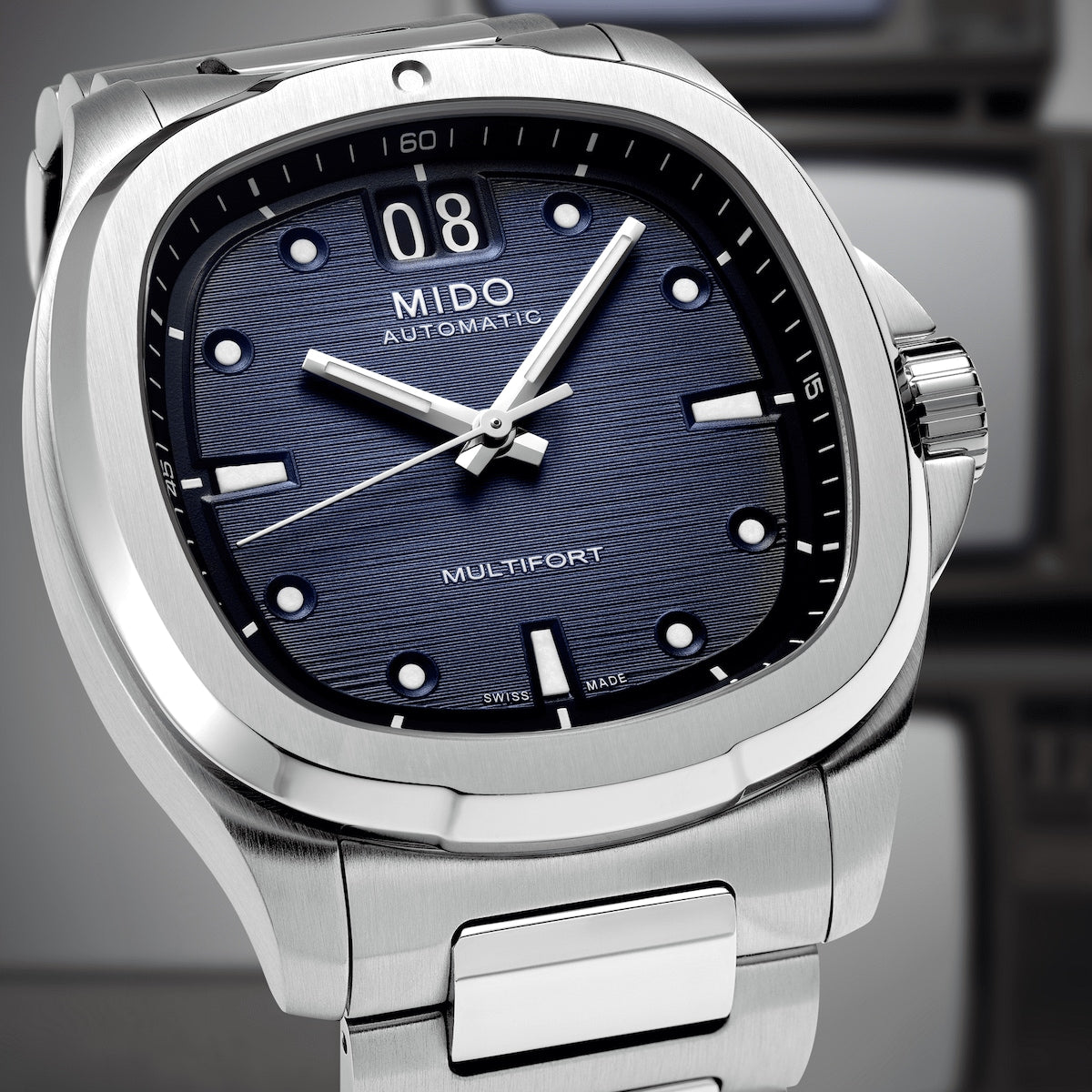 A brilliant flashback! Born from MIDO's extraordinary heritage, the TV-shaped case returns to the centre stage for the Multifort TV Big Date, as intense as it is precise, thanks to its formidable mechanical movement. The modern and dynamic design of this Swiss watch is underlined by a striking horizontal brushed finish dial and, along wtih its distinctive function: the BIG DATE at 12 o'clock. Its formidable latest-generation automatic movement, Calibre 80 is equipped with a high-tech balance spring in Nivachron™ which offers outstanding resistance to shocks and magnetic fields.