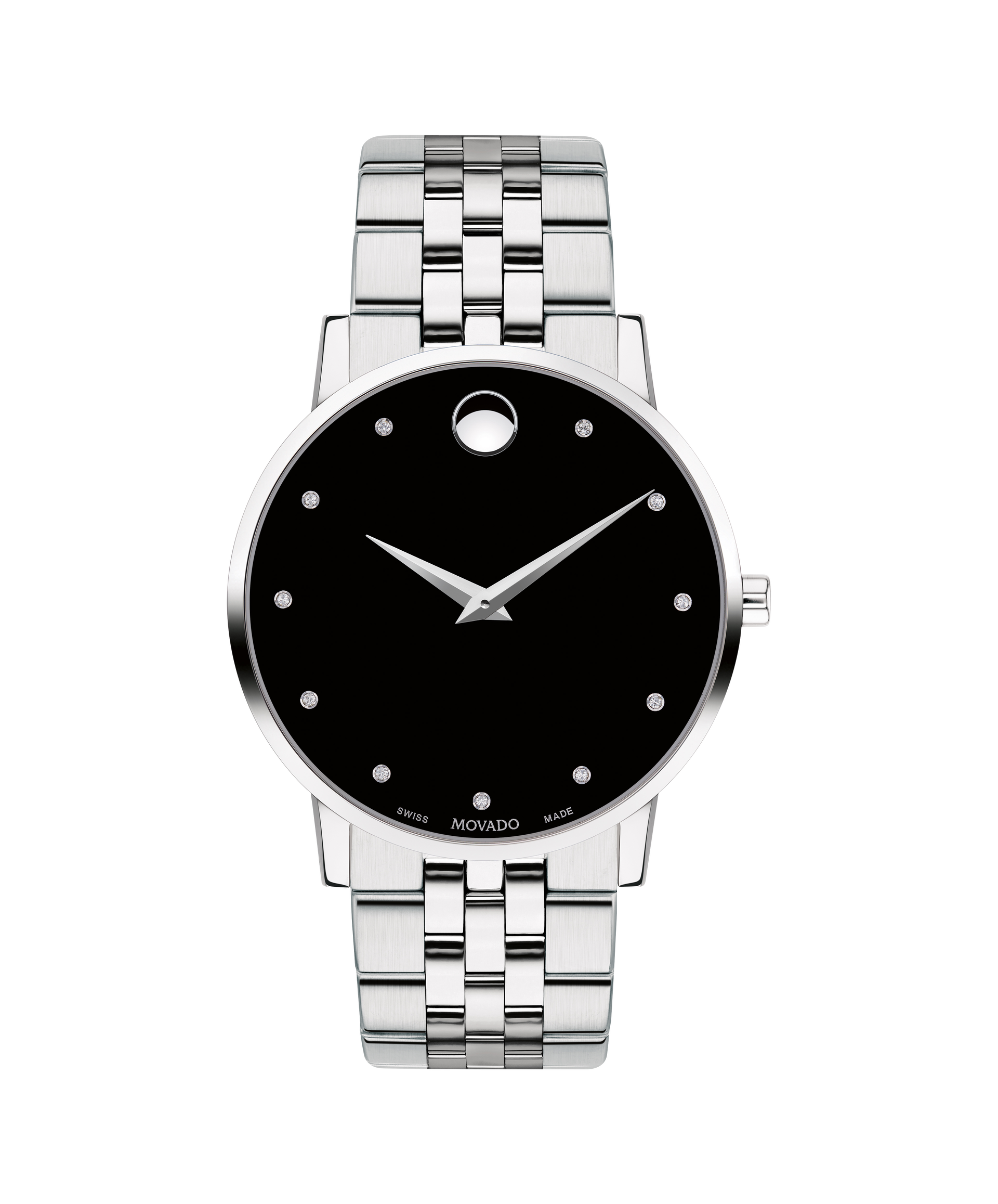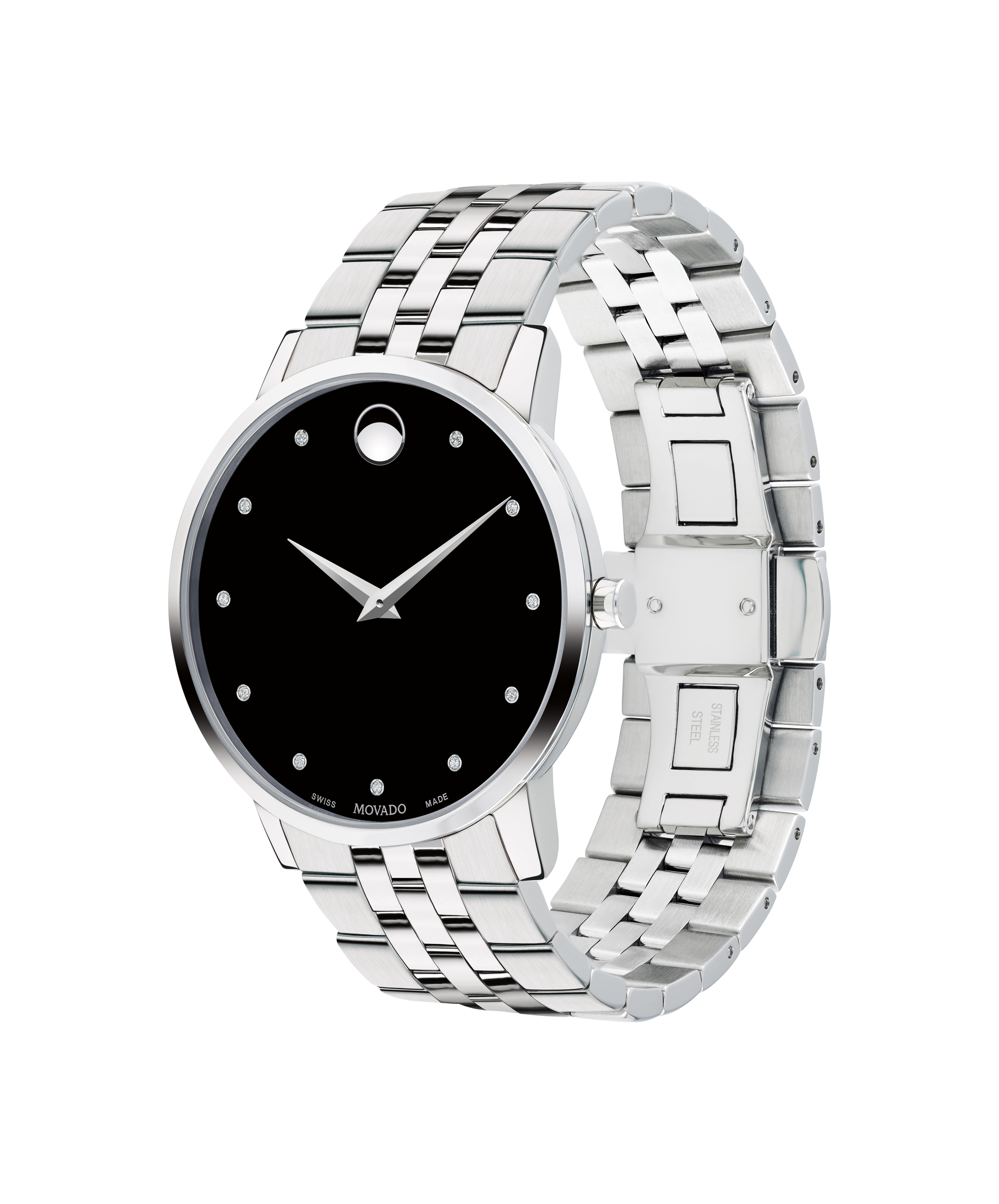 Men's Museum Classic watch, 40 mm stainless steel case, round black dial with 11 diamond markers (0.043 t.c.w.) and silver-toned dot and hands, stainless steel link bracelet with deployment clasp.