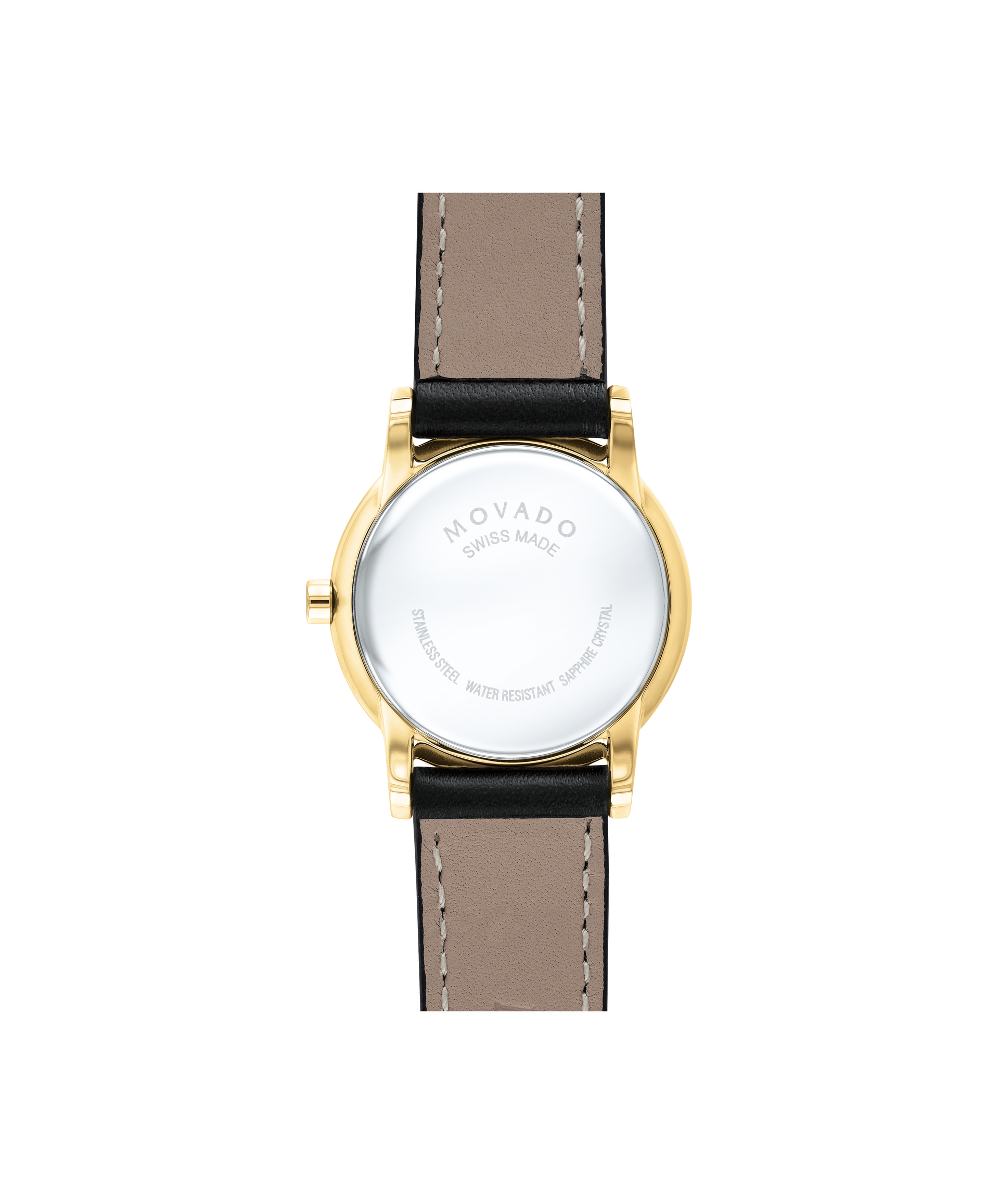 Women's Museum Classic watch, 28 mm yellow gold PVD-finished stainless steel case, black Museum dial with yellow gold-toned dot and hands, smooth black calfskin strap with yellow gold PVD-finished stainless steel buckle.
