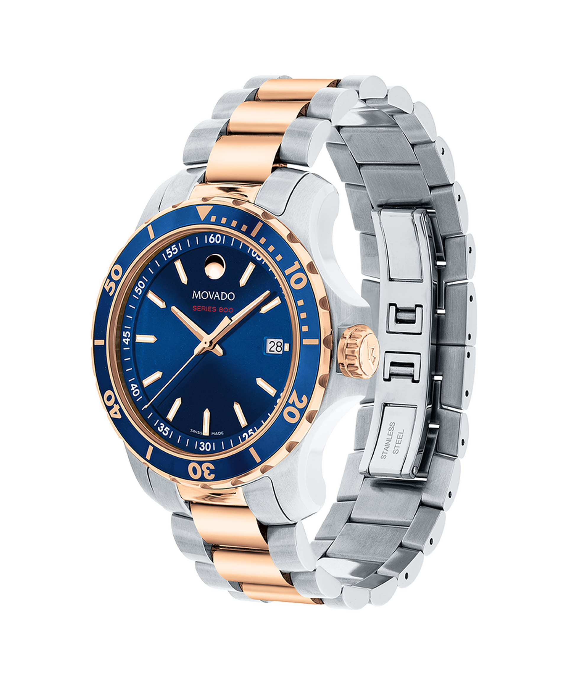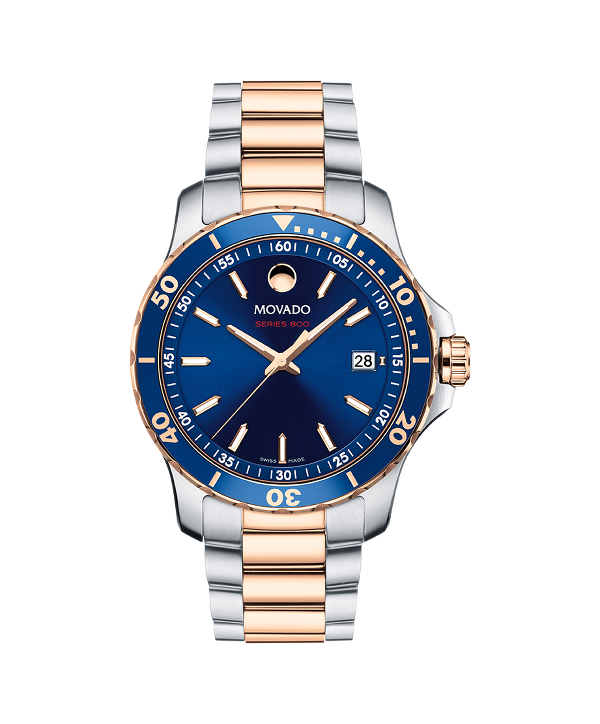 A modern take on elevated sporty style. Cast in stainless steel and warm rose gold PVD, this watch is a contemporary-cool statement piece. The 40mm case frames a blue sunray dial with Swiss Super-LumiNova® accents at the hand and hour markers, a date window, and our iconic dot at 12 o’clock.