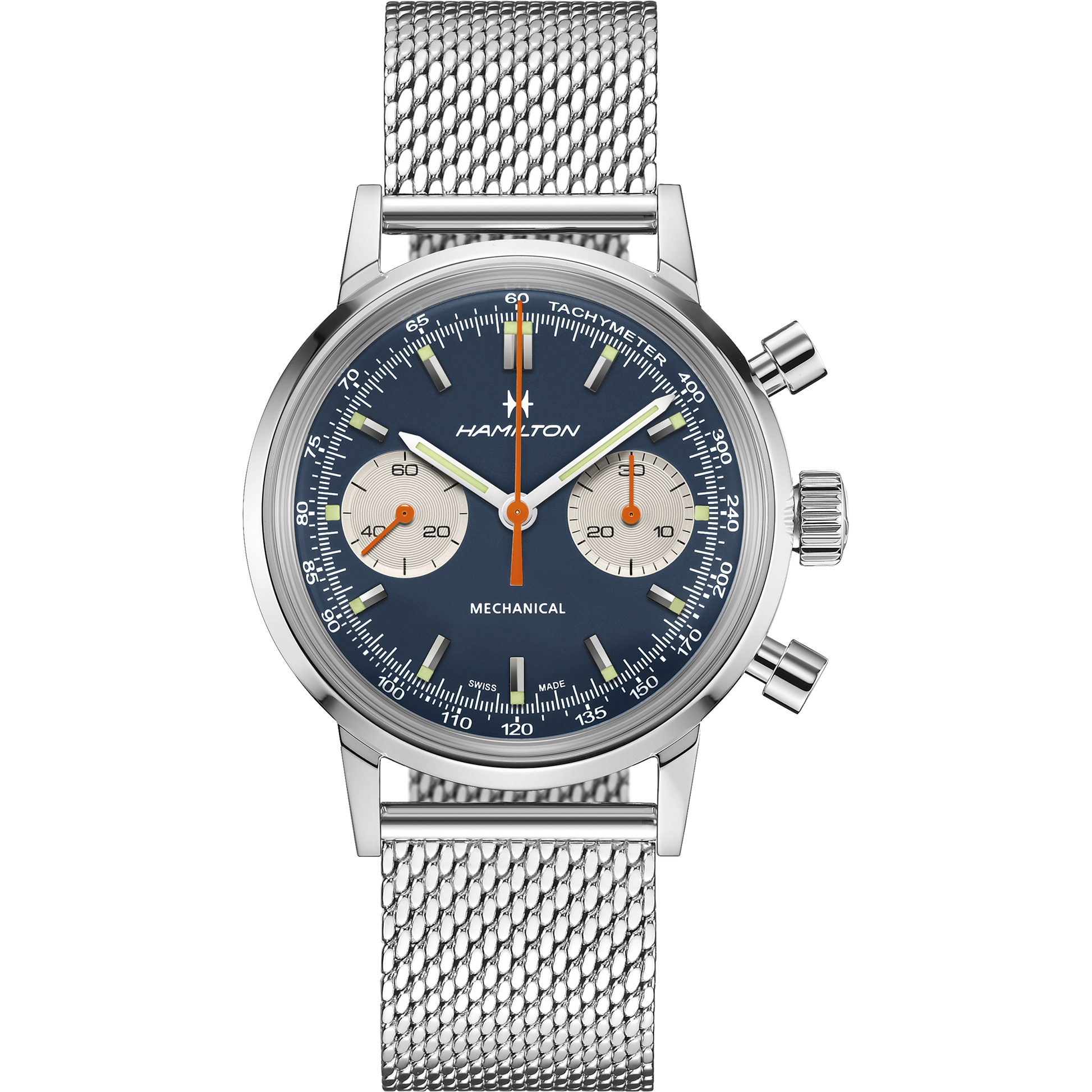 Dynamic and daring, the American Classic Chronograph 40mm featuring a blue dial with orange chronograph hands channels the energy of 60s and 70s racing culture. Its vibrant color pairing makes a striking impression, complemented by a perforated strap for an authentic motorsport feel. Paired with a second versatile mesh bracelet delivered in a bundle packaging, this automatic chronograph is built for those who live life at full throttle.