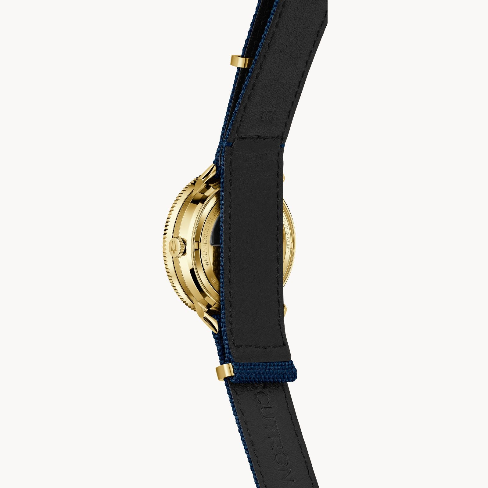 Accutron is proud to introduce a new addition to their storied Astronaut collection, honoring the original 1968 model. Staying true to the distinctive design of the... original version, this new Astronaut features a striking navy dial and distinctive matching navy day/night bezel. Featuring gold-tone hour hands, hour markers and a date display window, this Astronaut is outfitted with a matching navy cordura nylon NATO strap and features the Accutron Caliber 9058 GMT automatic movement with a 50-hour power reserve at 28,800 BPH and anti-magnetic resistance up to 16,000 a/m.