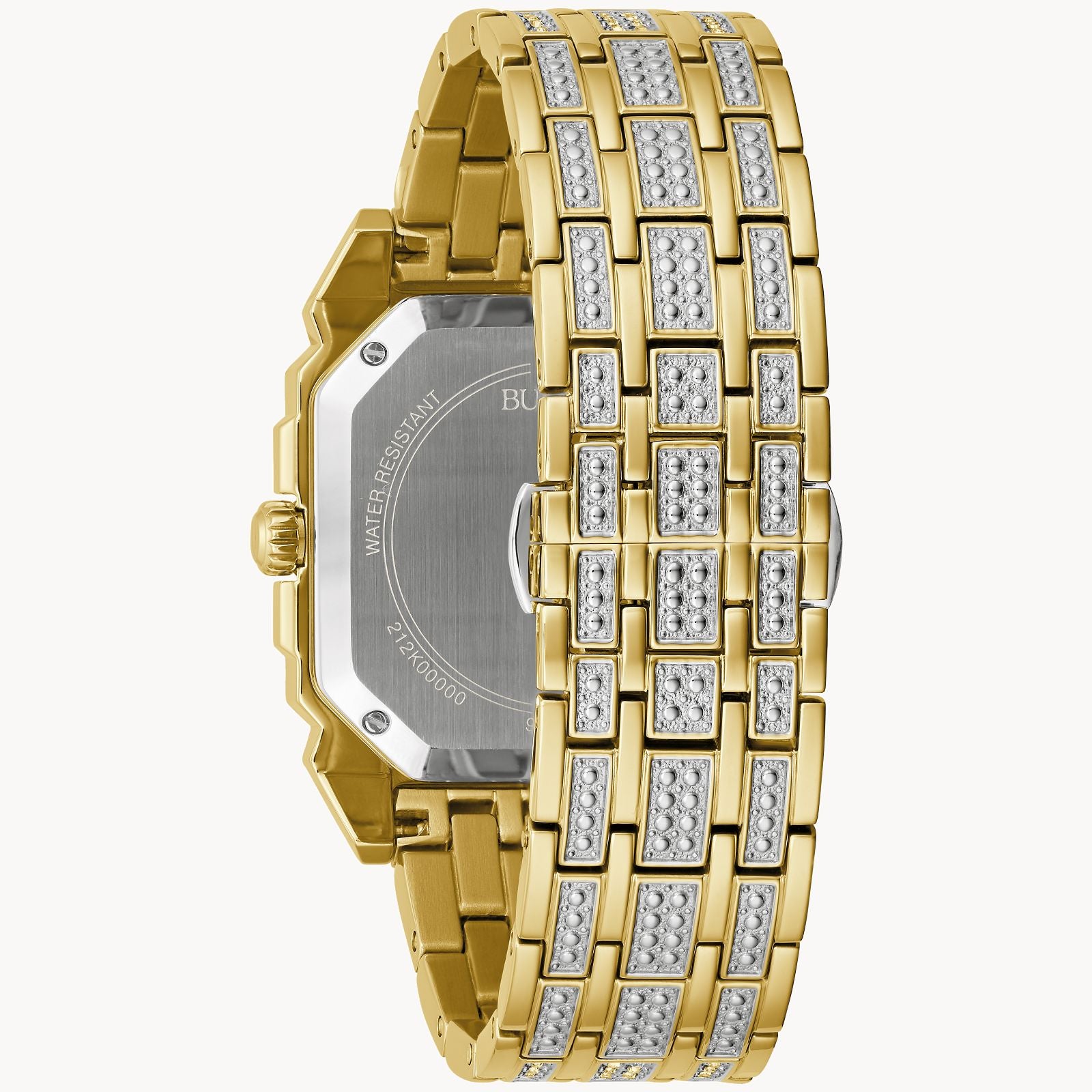 The latest Octava timepiece from the men’s dress classic Crystal collection arrives with brilliant style and contemporary appeal. The new, angular-shaped gold- and silver-tone stainless steel case surrounds the 3-hand silver-white and pave dial with bold Roman numeral accents and features 300 hand-set... crystals positioned on the dial, case, and bracelet to enhance the striking design. The gold- and silver-tone bracelet has a deployant buckle with pushers for easy closure. This sophisticated timepiece will take the wearer from day to night with effortless style.