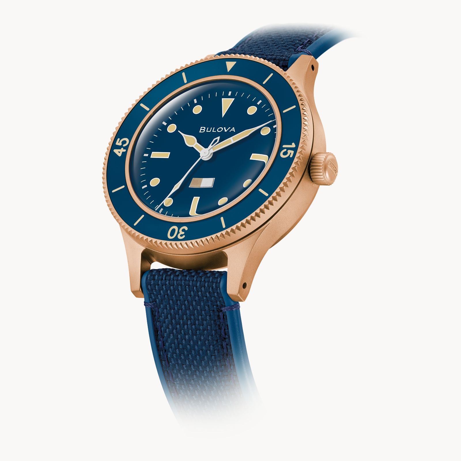 Honoring Bulova’s storied history with the armed forces and based on a rare prototype from 1957 developed for the U.S. Navy,... the Special Edition MIL-SHIPS Bronze celebrates Bulova’s 150th Anniversary and its legacy of innovation and fine craftsmanship. This newly reimagined timepiece features an elevated design with a sandblast-finished case made of CuSn8 bronze, a lustrous material with a rose-gold hue reminiscent of 19th-century copper diving helmets. Bronze is much stronger than copper, and over time, it forms a natural patina, adding a protective layer that enhances its durability and enriches its unique, timeless look. Distinctive features include a deep blue dial with a matching aluminum bidirectional bezel insert, a vintage-inspired handset with super luminous hands and markers, a bi-color moisture strip indicator strip, and a double-domed sapphire crystal with a 5-layer anti-reflective coating. Paired with an upgraded deep blue 18mm strap made of a hybrid of rubber and Cordura® nylon for durability and comfort and powered by a 21-jewel automatic movement with a 60-hour reserve, it showcases a commemorative 150th Anniversary embossed case back and is water resistant up to 200 meters. Delivered in premium packaging with a storybook, this heritage-inspired MIL-SHIPS Bronze men’s timepiece is a must-have for collectors and enthusiasts alike.