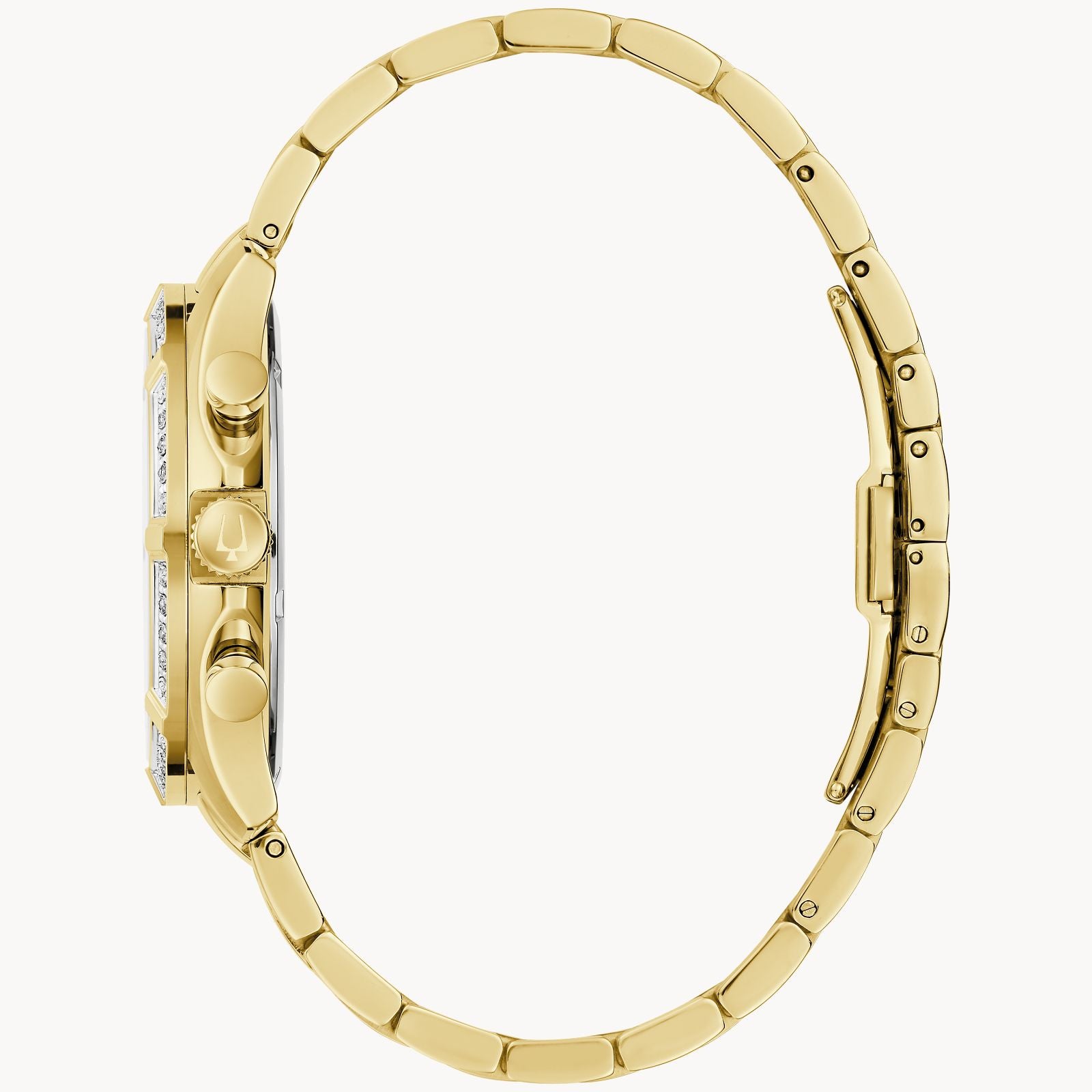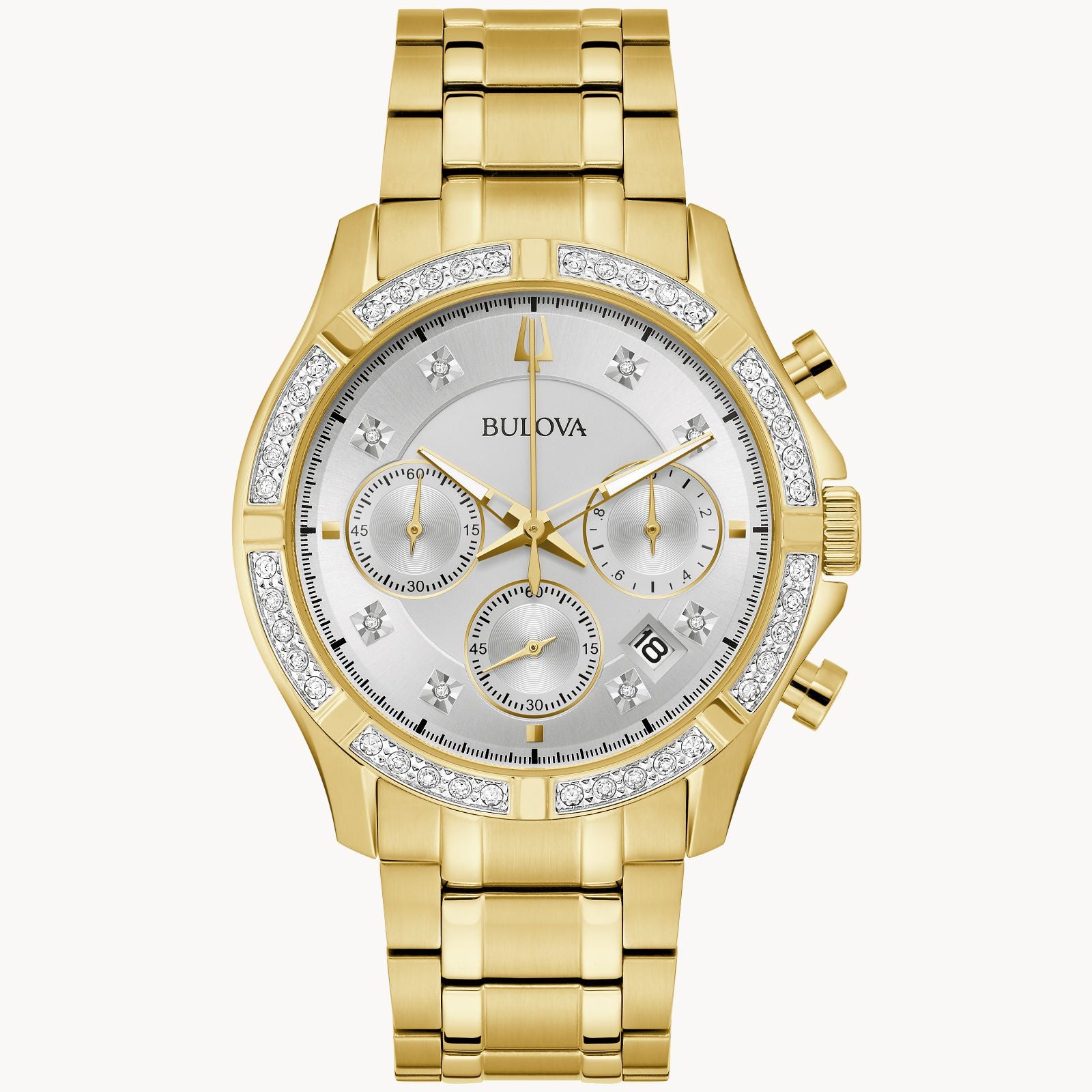 This men’s six-hand chronograph from the Bulova Classic collection balances sporty flair and timeless luxury. Encased in gold-tone stainless steel, its sleek silhouette exudes sophistication, further elevated by the presence of 24 dazzling diamonds meticulously set in the bezel. The tiered silver-white dial... commands attention with 8 diamond markers, alongside a date and three sub-dials showcasing running seconds, chronograph minutes, and chronograph 1/20 seconds. The timepiece is paired with a gold-tone stainless steel bracelet with a double press deployant buckle closure providing a secure fit. Designed to accompany a luxurious lifestyle, this Bulova men’s timepiece is an indispensable part of any discerning collection.
