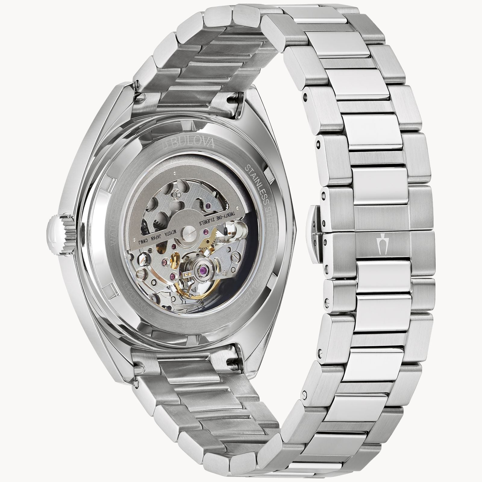 This new men’s automatic timepiece from the Bulova Surveyor collection offers modern design and luxurious craftmanship at an exceptional price. The contemporary stainless-steel case delivers an eye-catching brushed and polished surfaces with a subtle angularity and a domed mineral crystal.... The remarkable dial is dominated by the display of the skeletonized automatic 21-jewel movement, which features a 42-hour power reserve. Surrounding the dial is a blue chapter ring with applied hour indices, which is complemented by angular hands with luminescent fill. The watch is paired with a matching stainless-steel bracelet for a seamless look on the wrist. With a captivating dial and appealing design, this watch is the perfect timepiece for everyday style.