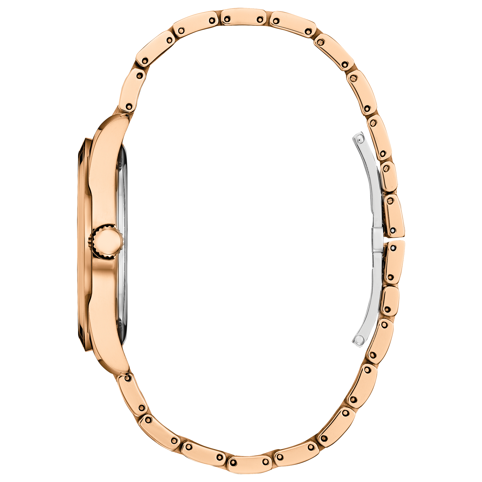 Make a statement wearing this sophisticated, classically styled Arezzo ladies’ watch by Citizen. This sleek watch with its white dial, rose gold-tone...bracelet band with deployment clasp and bold Roman numeral markers stands out from the crowd while remaining understated. This is a modern twist on a classic design, featuring a genuine Sapphire crystal and Citizen’s Eco-Drive technology that sustainably powers itself by light. This women’s classic dress watch in srose gold features three hands and a minimalist face, giving you a refined look and upscale feel. Never compromise with the bold and elegant line of Arezzo watches by Citizen.