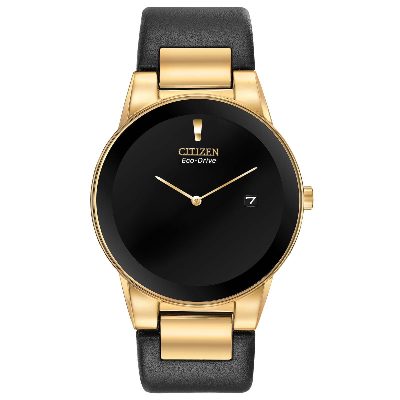 Axiom's refined yet sleek design offers a day-to-night fashion options for the avid trendsetter. A watch with CITIZEN's Eco-Drive technology, not just a solar...watch, but powered by any light, featured in a men's gold-tone stainless steel case, black leather strap with black dial and the intriguing feature of edge-to-edge glass. Caliber number J165.