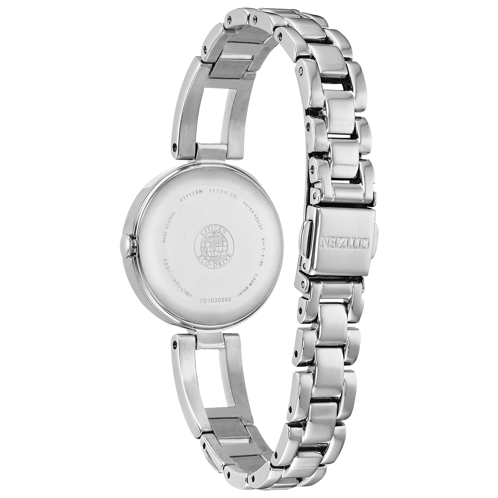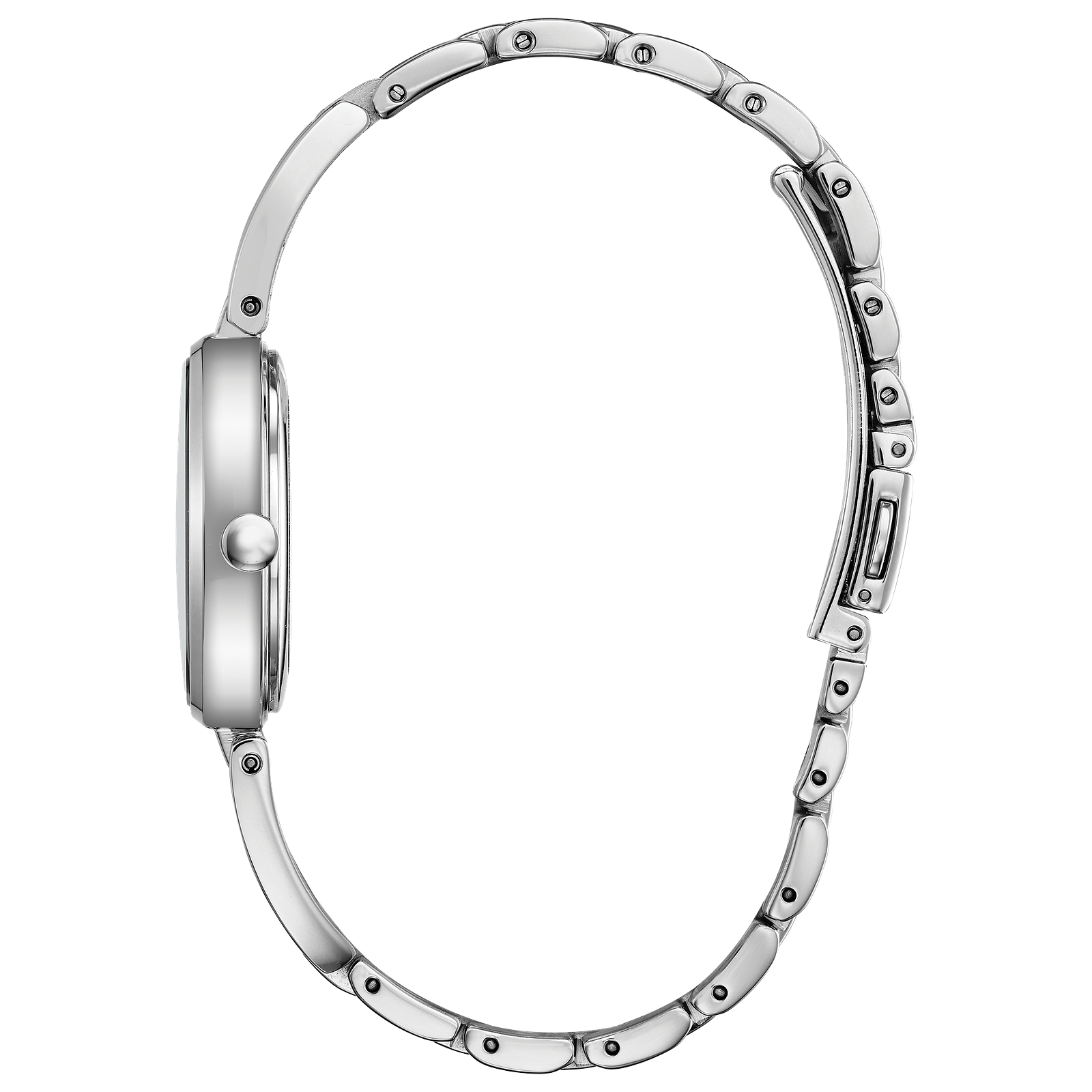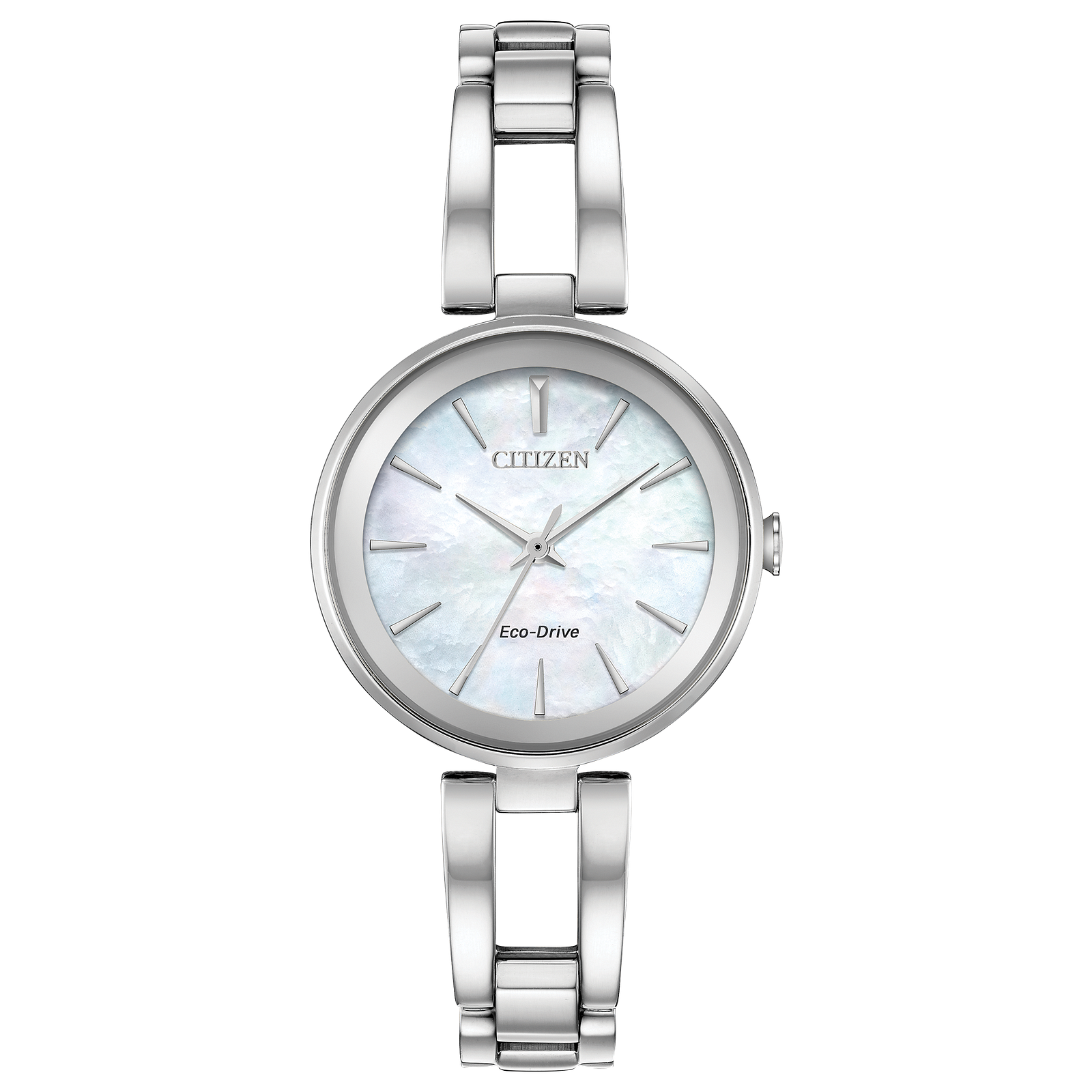 Axiom's refined yet sleek design offers a day-to-night fashion option with edge-to-edge glass design for the modern trendsetter. This timepiece, with...Eco-Drive technology, features ladies' stainless steel case and bracelet with white Mother-of-Pearl dial. Featuring our Eco-Drive technology – powered by light, any light. Never needs a battery. Caliber number E031.