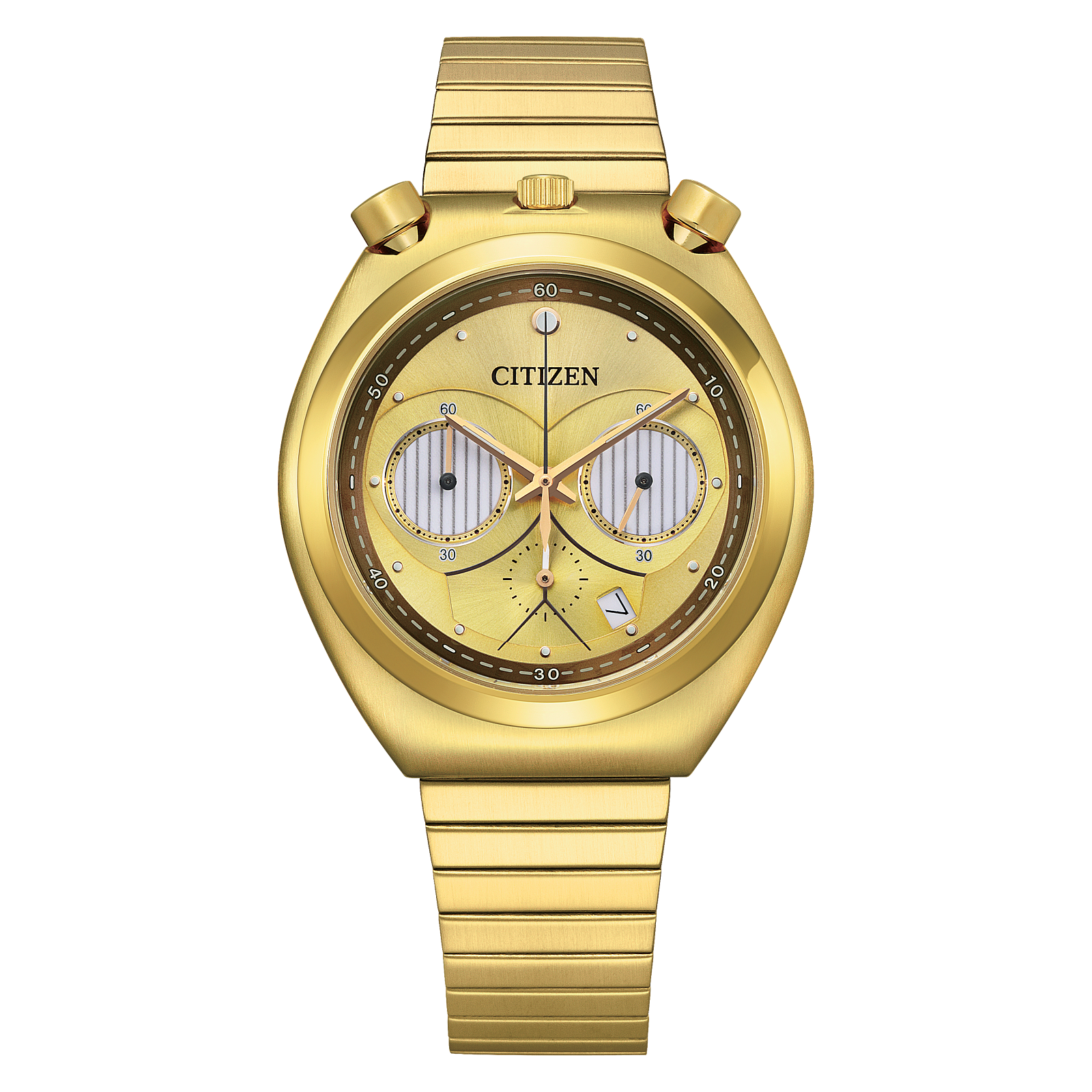 C-3PO™ was more than a meticulous droid designed for human/cyborg relations, he was a loyal friend who helped save the galaxy more than once, and that...spirit shines through in this gleaming collector’s piece. Part of the Star Wars™ | Citizen Tsuno Collection, the gold-tone brass dial echoes C-3PO’s face, with “eyes” that glow in the dark, surrounded by a gold-tone stainless steel case. The watch features a 1-second chronograph, a date display, and a gold-tone stainless steel bracelet. The case back is etched with the Star Wars logo and a detailed likeness of C-3PO. This exclusive collection features 4 special timepieces, each with a vintage design inspired by Citizen’s iconic 1972 model known as the Tsuno Chrono, thanks to the tsuno “horns” placed on both sides of the 12 o’clock position. This watch requires a battery. Caliber number 0510.