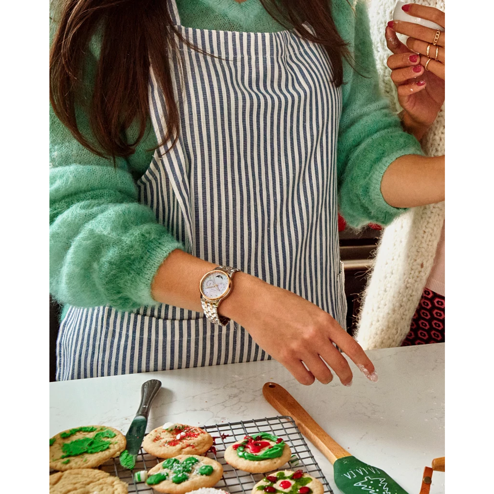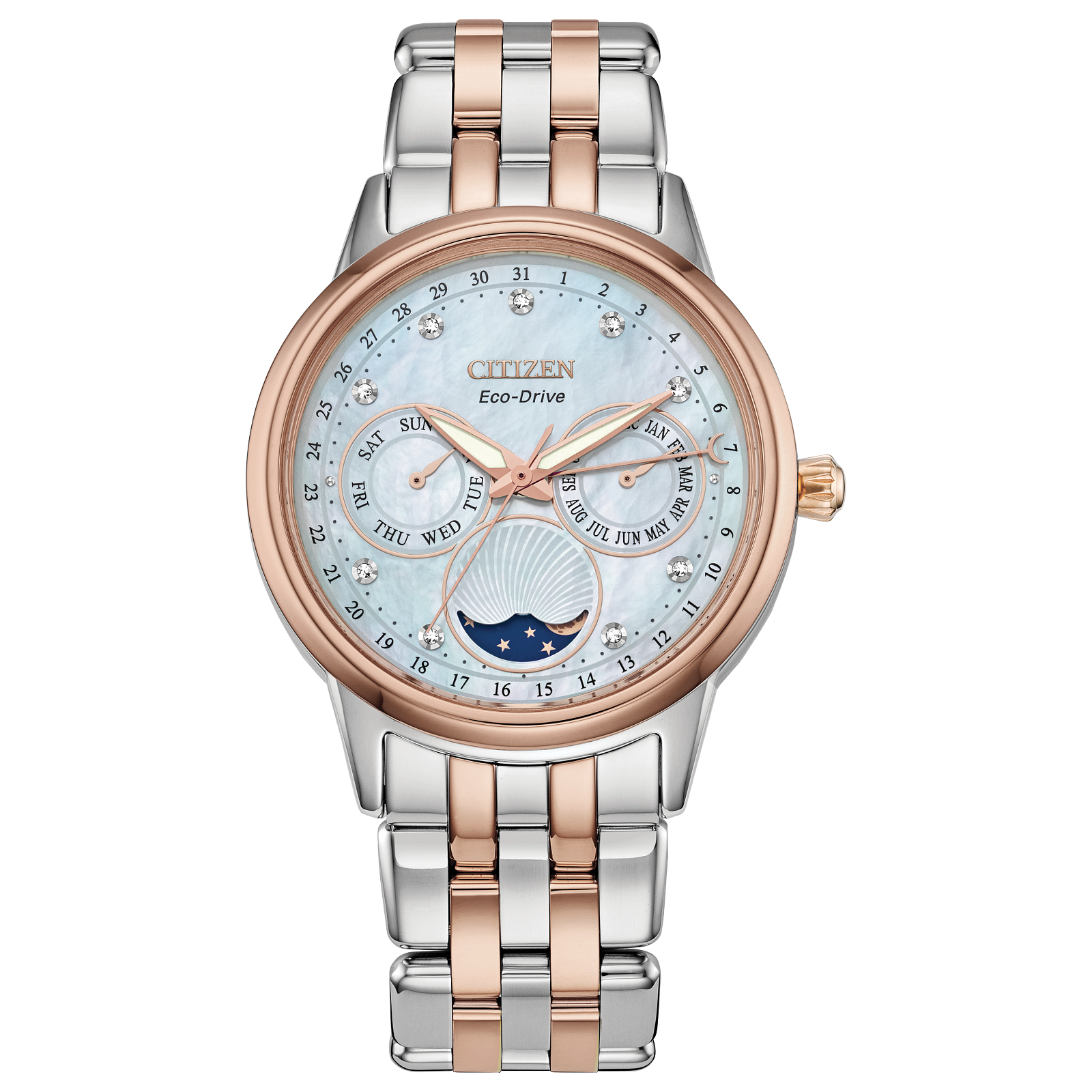 For a touch of modern elegance paired with advanced complications, Citizen’s Calendrier women’s watch fits the bill. It has a pink-gold-tone stainless...steel bracelet and pink-gold-tone 37mm case, with a white mother of pearl three-hand dial set with diamonds. It uses Eco-Drive technology, so it is powered by light — any light — and in addition to showing the month, day and date, it also keeps track of the phases of the moon.