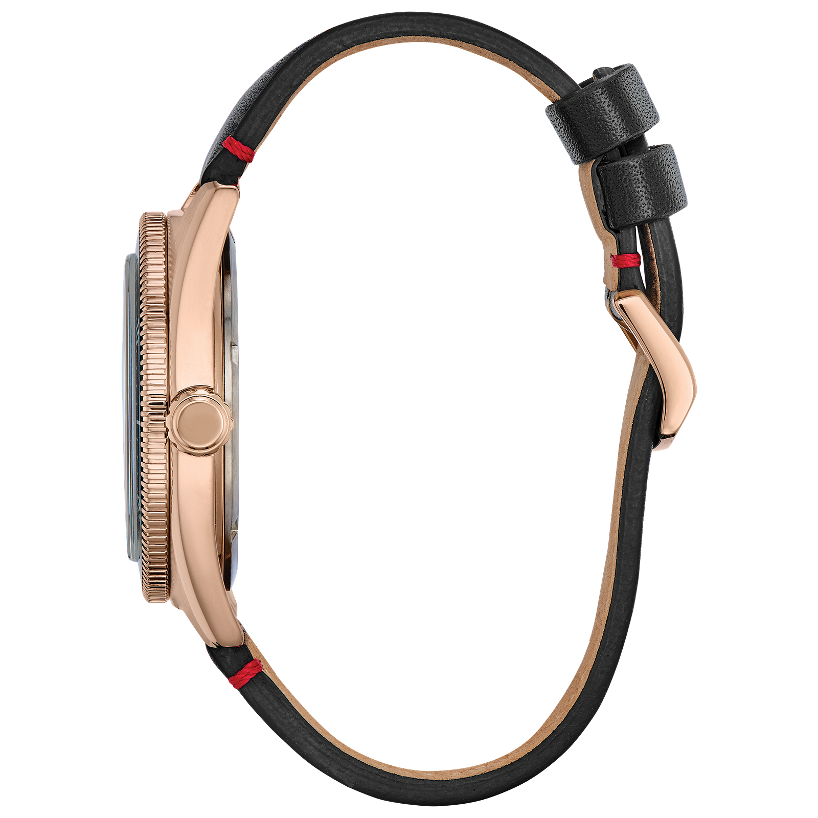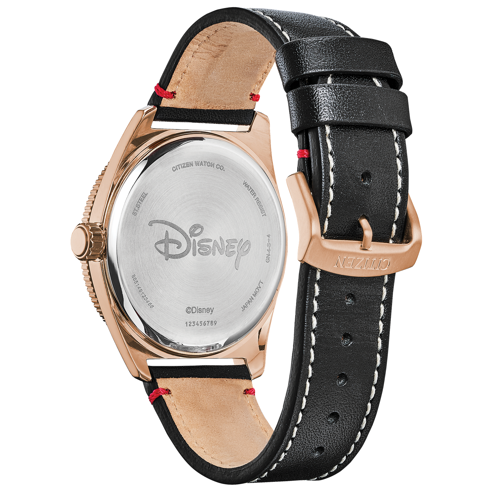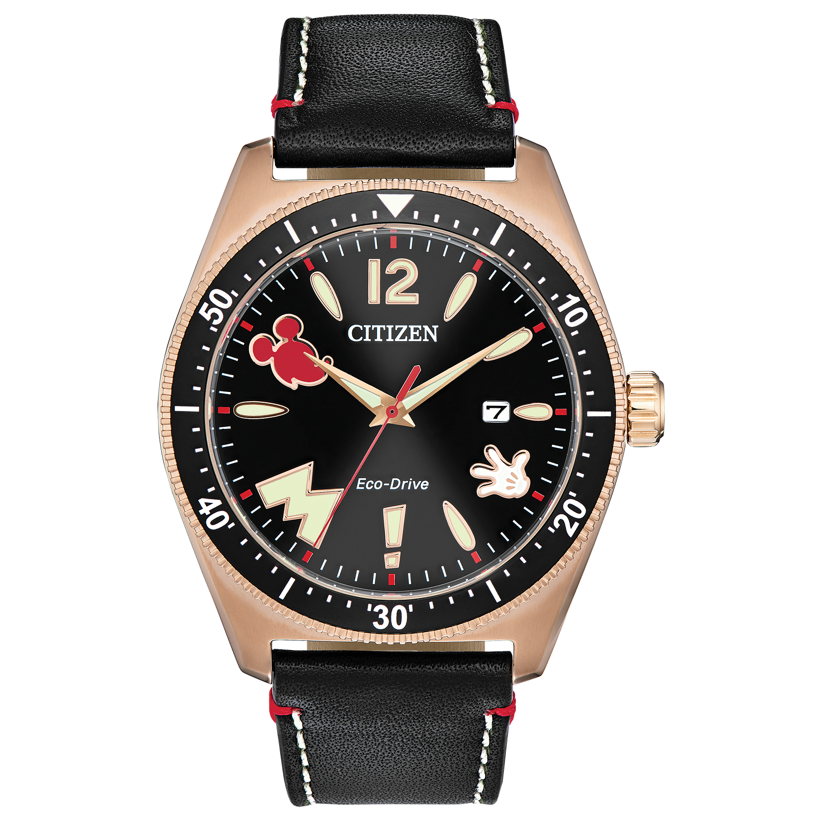 Calling all Mickey Mouse fans! This vintage-inspired Disney Mickey Mouse watch features a bright red icon accented against a black dial with date display. A...rose gold-tone stainless steel case is complemented by a black leather strap with contrast stitching. Powered by light using Citizen Eco-Drive technology, it never needs a battery. ©Disney