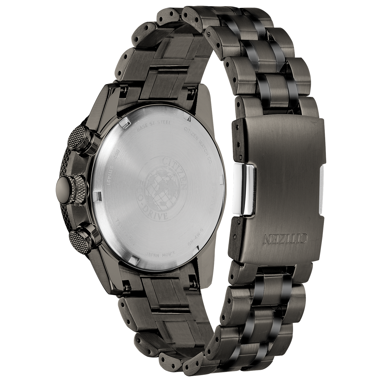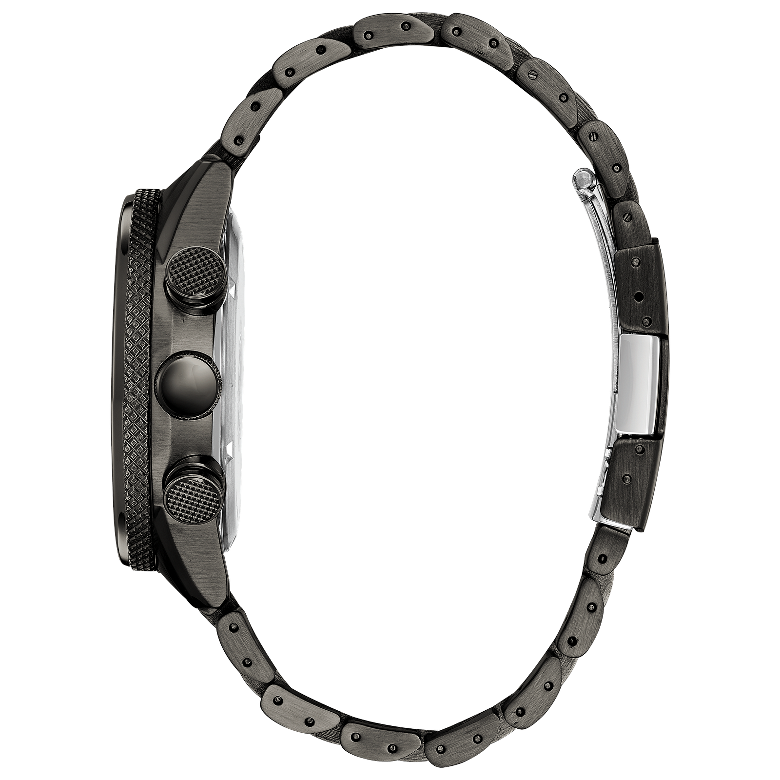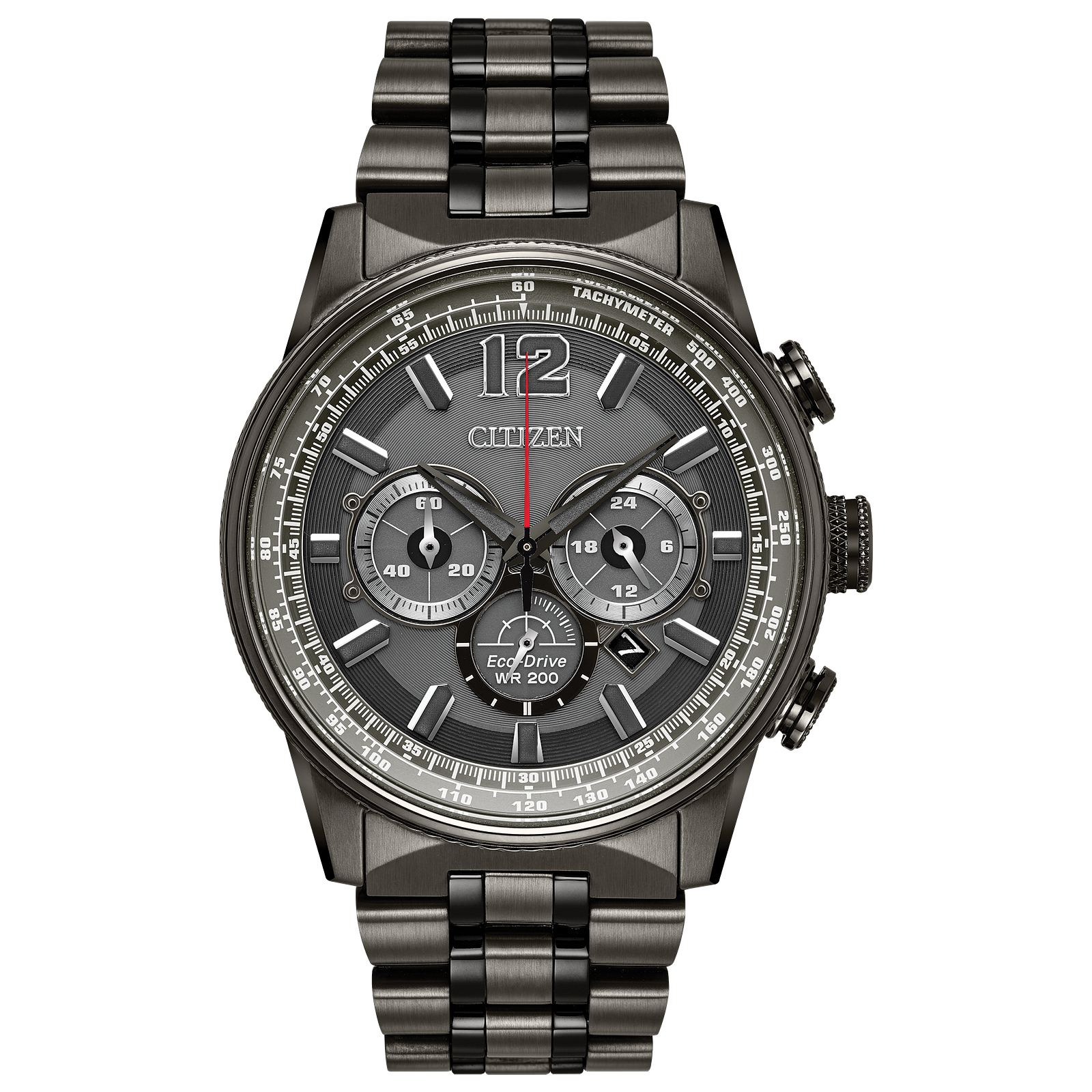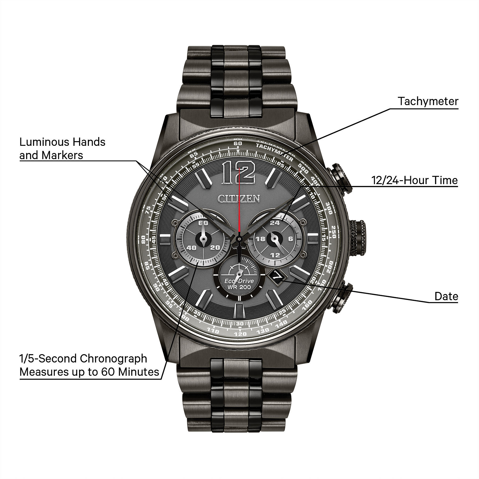 Style meets function in the Citizen Nighthawk with a sporty appeal. Designed with a granite ion-plated stainless steel case and bracelet with a charcoal...gray dial with red accents, the advanced features include a 1/5 second chronograph that measures up to 60 minutes, 12/24 hour time, and a tachymeter that measures speed based on time traveled over a distance. This must-have men’s watch also features a screw-down crown, a safety foldover clasp with push button, and water resistance to 200 meters. Made with our proprietary Eco-Drive technology that’s sustainably powered by any light and never needs a battery, this versatile men’s watch becomes your weekday to weekend wardrobe staple. Caliber number B620.