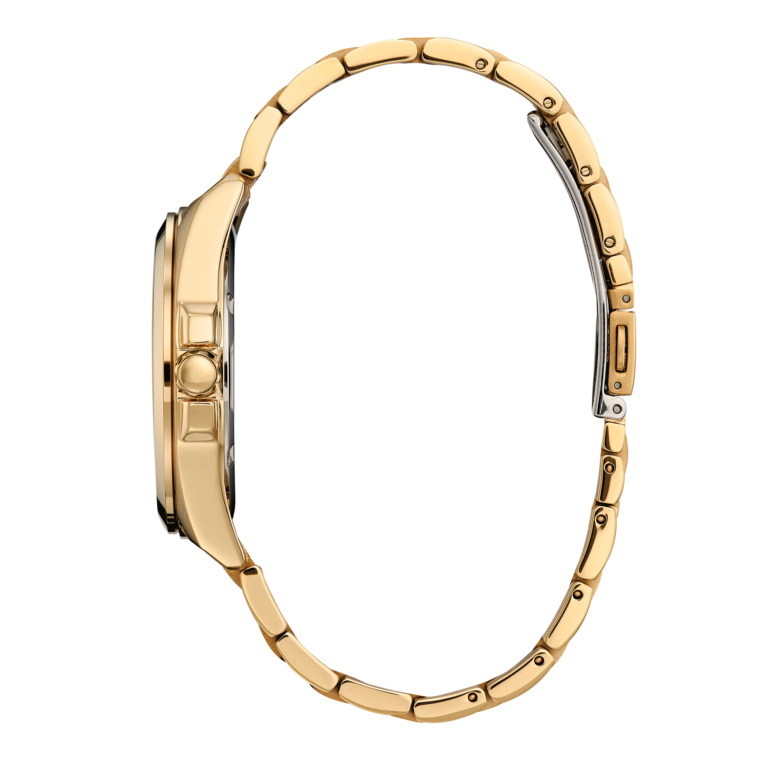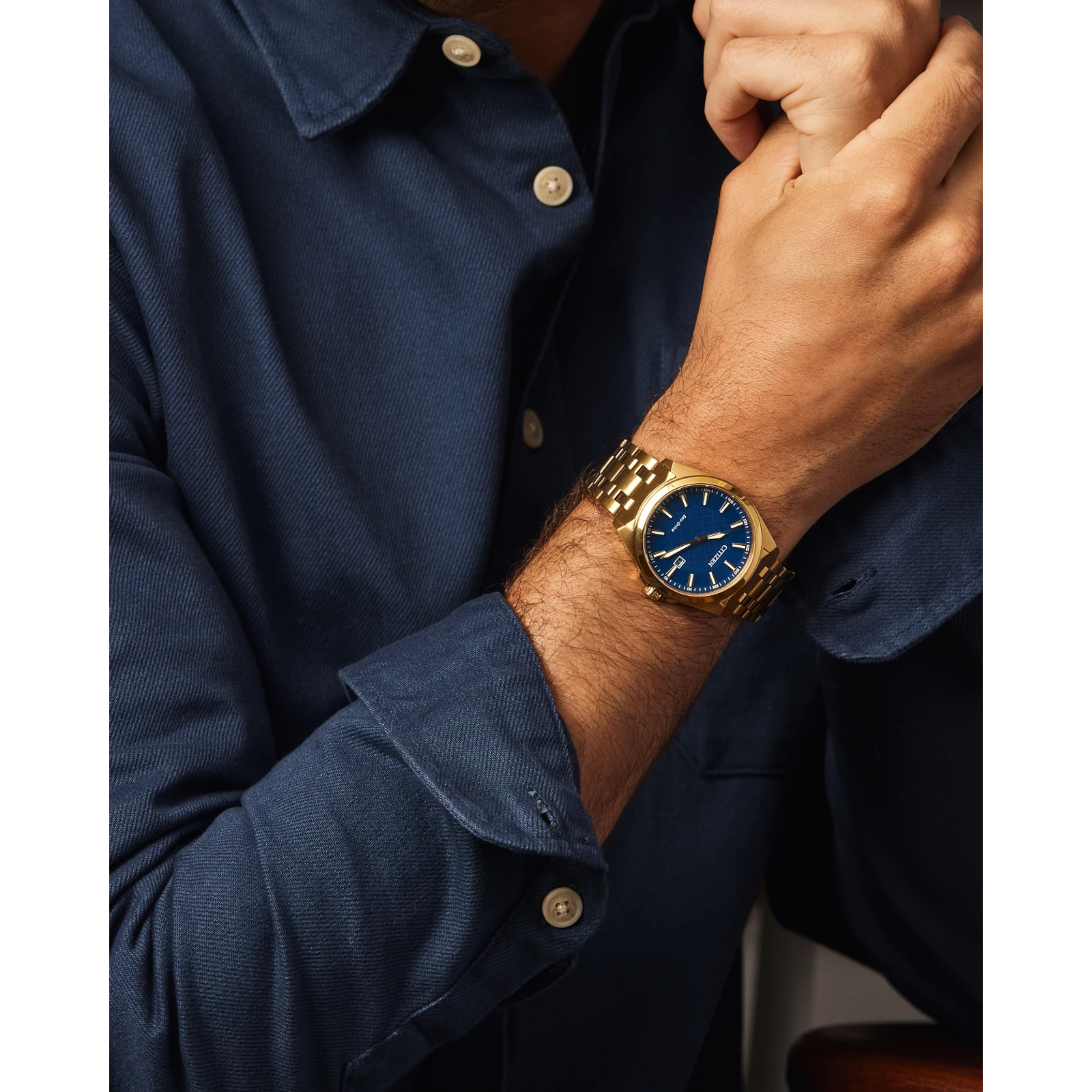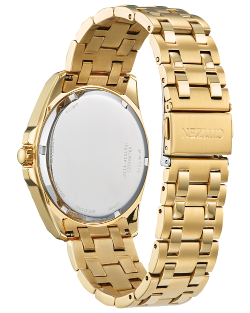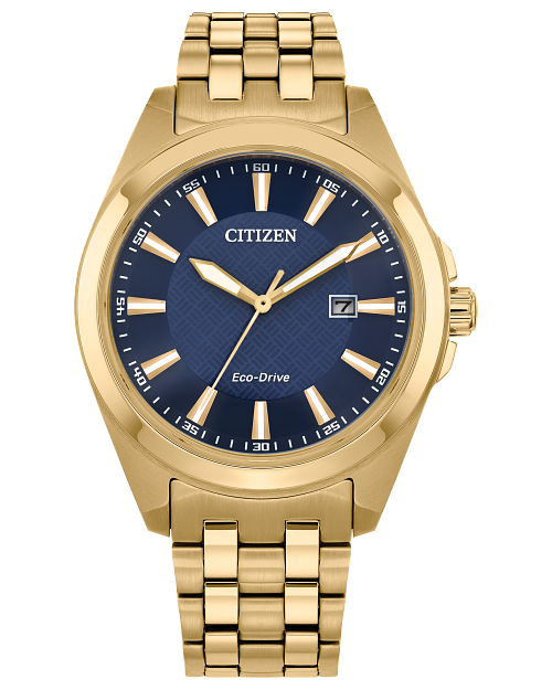 Make a distinctive style statement. Featuring a gold-tone stainless steel case and a blue 3-hand dial encased in sapphire crystal, this men’s timepiece is...a combination of functional simplicity with a touch of elegance. The gold-tone stainless-steel bracelet has a fold over clasp with push buttons, giving the watch an understated refinement. Water resistant to 100 meters and sustainably powered by any light with Eco-Drive that never needs a battery.