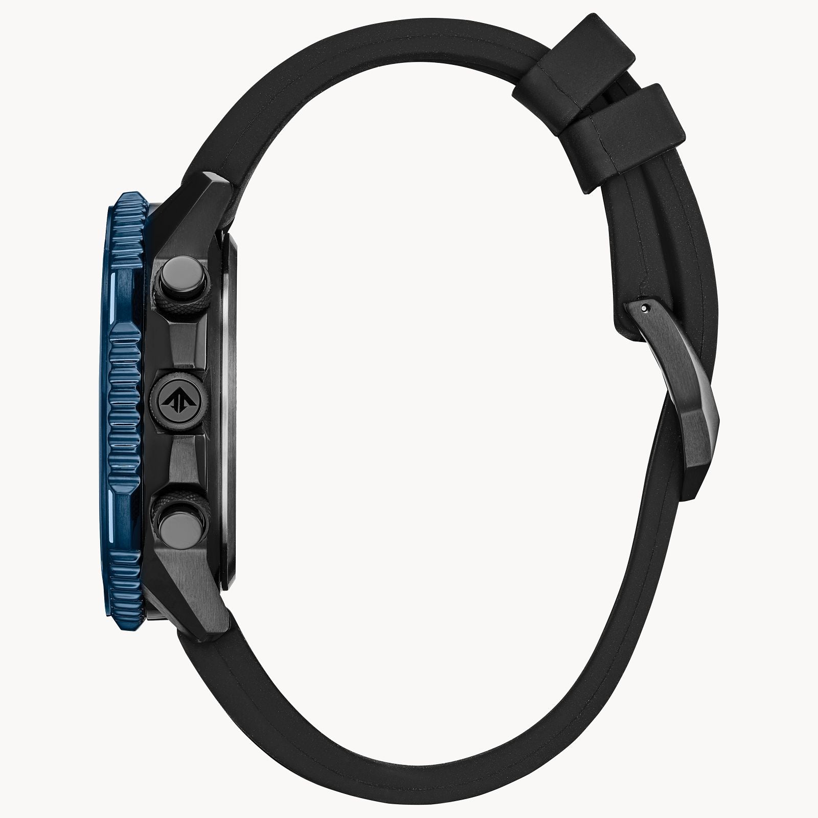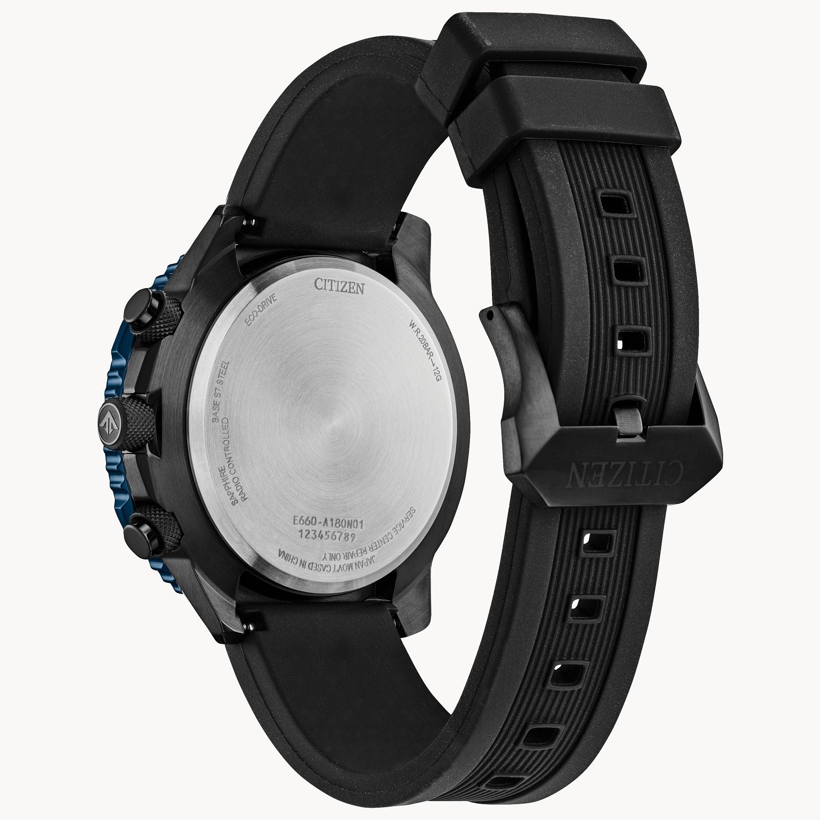Take to the skies and look stylish on land, too – with the innovative Promaster Air men’s chronograph watch from Citizen. This exceptional, pilot-inspired...watch features a silver-tone stainless steel case accented by a black stainless steel case that holds a blue ion-plated rotating bezel with a professional calculator function and tachymeter on a blue dial with luminous hands and markers and a sapphire crystal. The advanced technology of this timepiece incorporates atomic time clock synchronization for superior accuracy, a 1-second chronograph that measures up to 60 minutes, and a perpetual calendar. The black polyurethane strap fastens with ease and like other watches in the Promaster line, it is water resistant up to 200 meters. This sporty, high-performance watch utilizes Eco-Drive technology that’s sustainably powered by any light and never needs a battery.