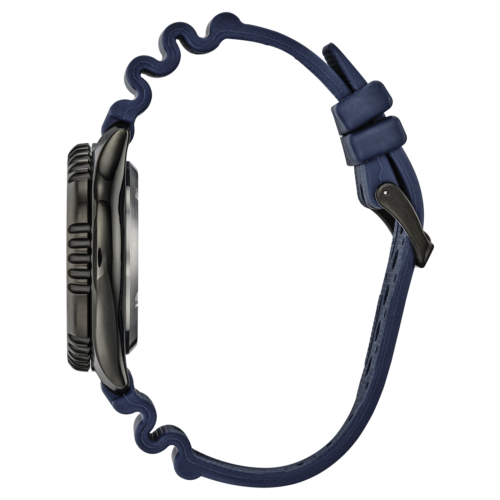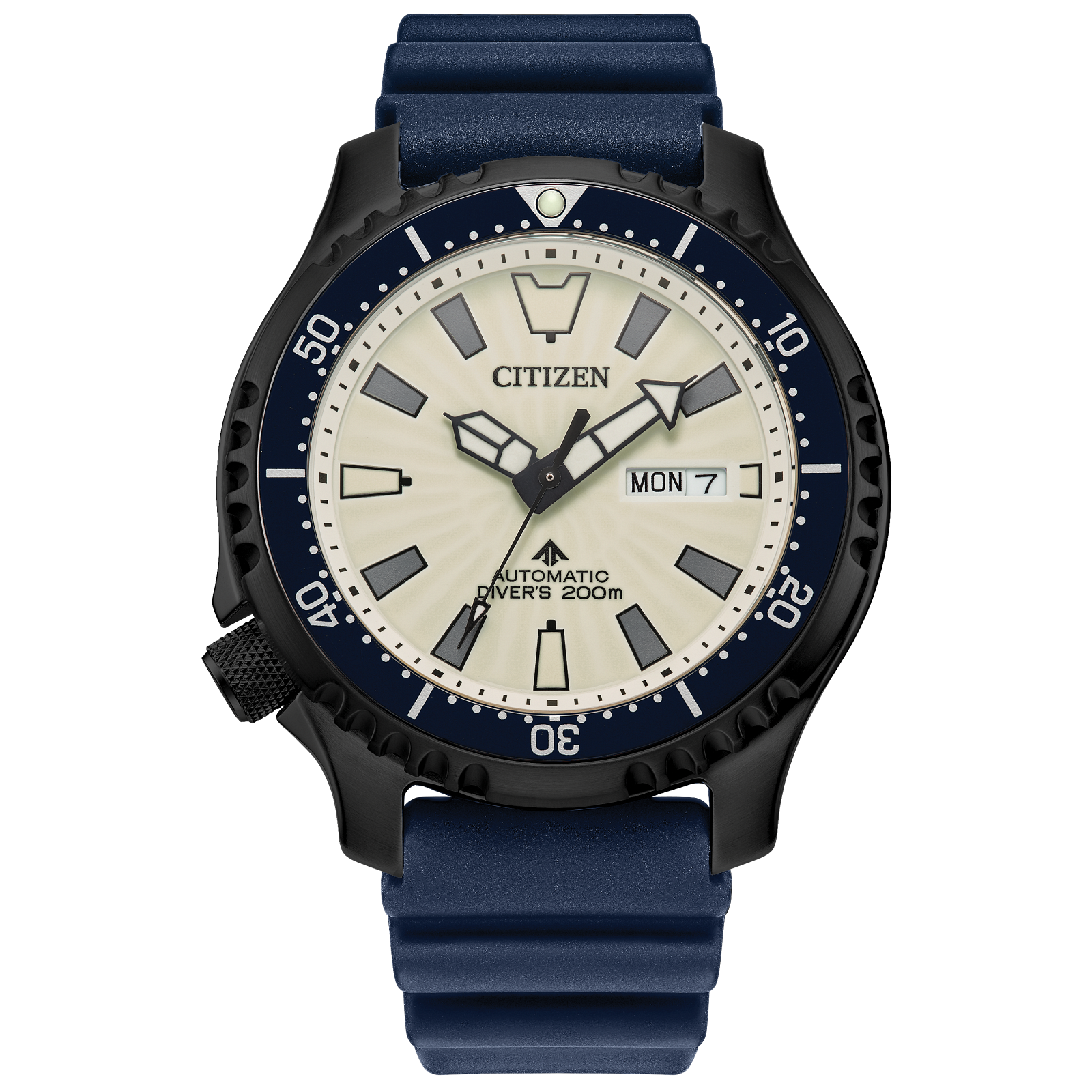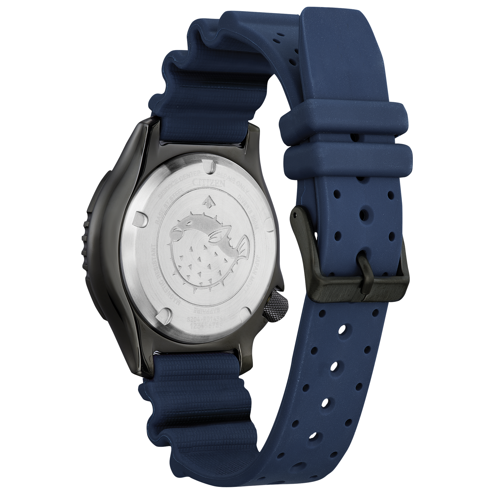 A classic never goes out of style. The newly reimagined Promaster Dive Automatic men’s watch by Citizen goes deeper into the history of the...original version of this diving watch that was released in 1989 for the new generation of dive watch enthusiasts. A design element that stands out is the distinctive, serrated bezel design that was inspired by a “Fugu,” the Japanese name for pufferfish. Featuring a 3-piece, 44mm case, anti-reflective sapphire crystal, and durable blue polyurethane strap, the blue easy grip aluminum ring surrounds the white fully luminous dial, while the case back features an engraving of a fugu or pufferfish. This technically advanced and stylish men’s sport watch powered by the motion of your wrist comes in an exclusive collector’s dive tank box and is ISO compliant with a screw-down crown and water resistant to 200 meters. Caliber 8204.