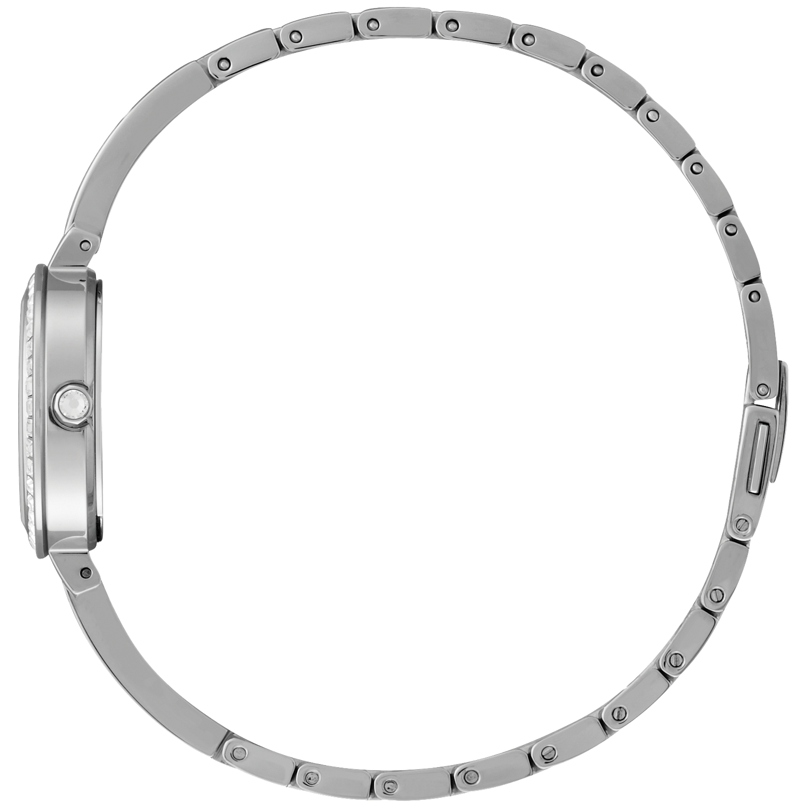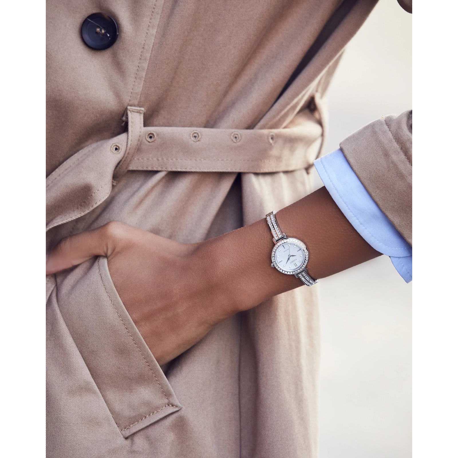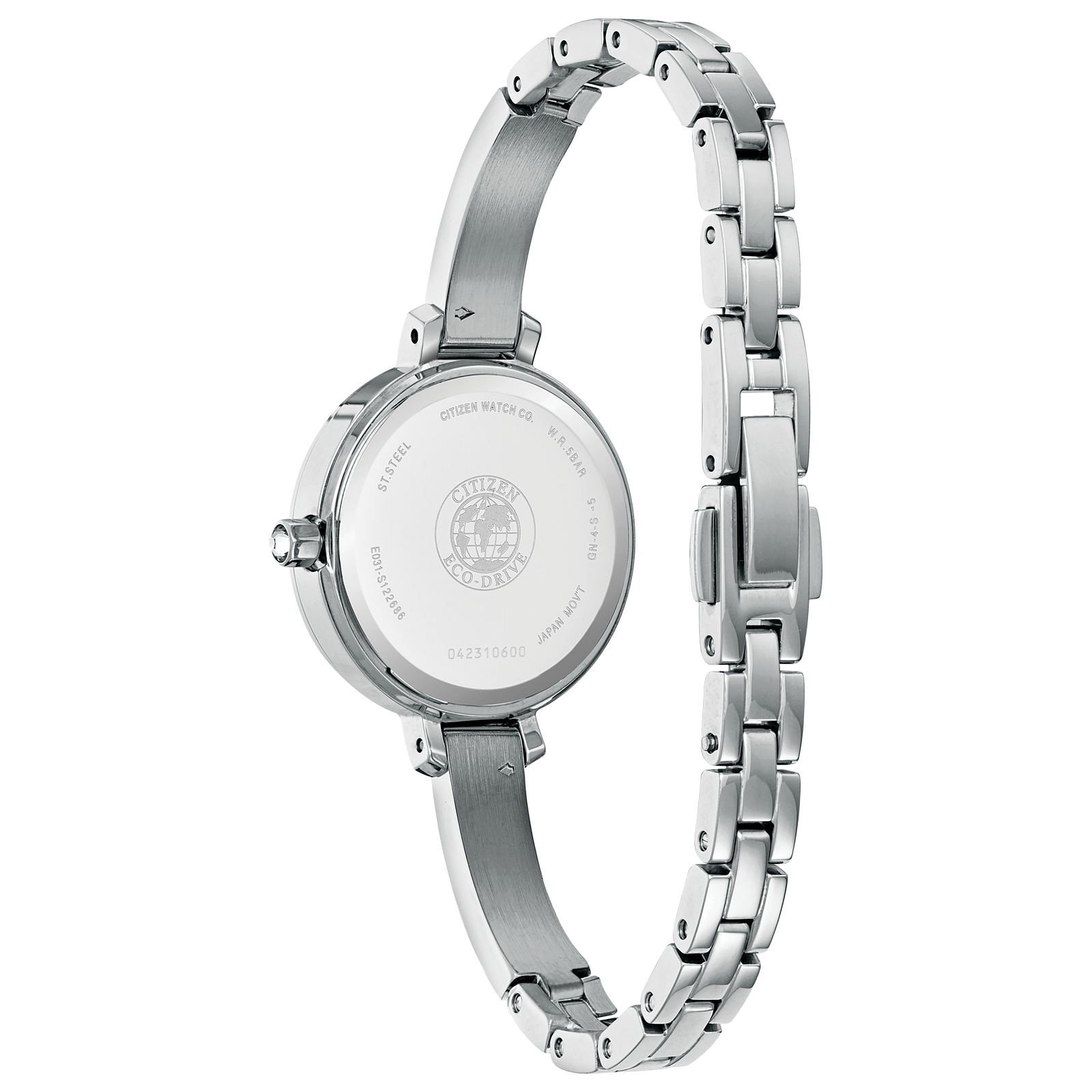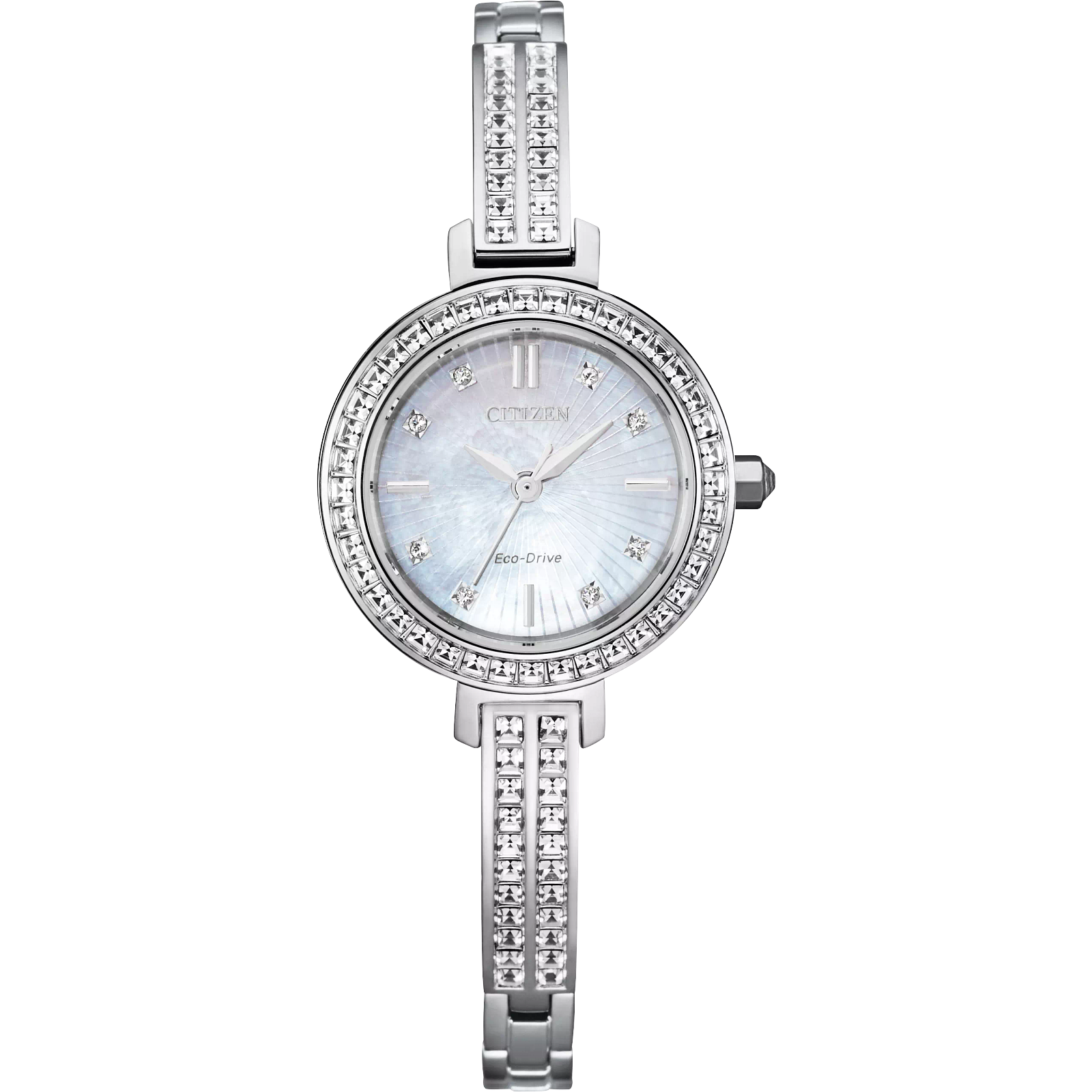 An exciting addition the Silhouette Crystal collection from Citizen is the princess cut bangle design. Both the stainless-steel bracelet and 25mm...stainless-steel case are inset with crystals and the delicate profile means this timepiece can easily be worn alone as a statement piece, or alongside other bracelets for a unique and stunning formal look. It has a mother of pearl face, a three-hand dial and runs on Eco-Drive technology, so it is powered by light — any light.