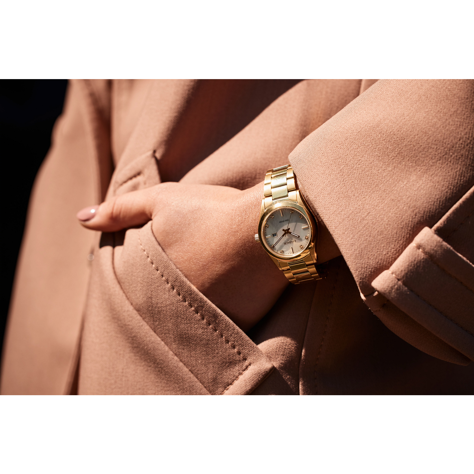 When sporty style meets luxury, you get this latest stunner from Citizen. Joining ready-for-anything wearability with feminine elegance, this...time-and-date timepiece is the ultimate day-to-evening watch to wear. The silver-tone stainless steel case measures 33mm in diameter and is presented on a silver-tone, 3-link stainless steel bracelet for a sleek, versatile wear on the wrist. The radiant blue dial is characterized by its highly legible style and diamond accents, elevating the sporty wearer one step further. A water resistance up to 100 meters helps the dynamic watch maintain a host of functionality without compromising its alluring appearance. Powered by Citizen’s proprietary Eco-Drive technology to provide light-powered vitality continuously and sustainably without ever needing a battery. Caliber E013.