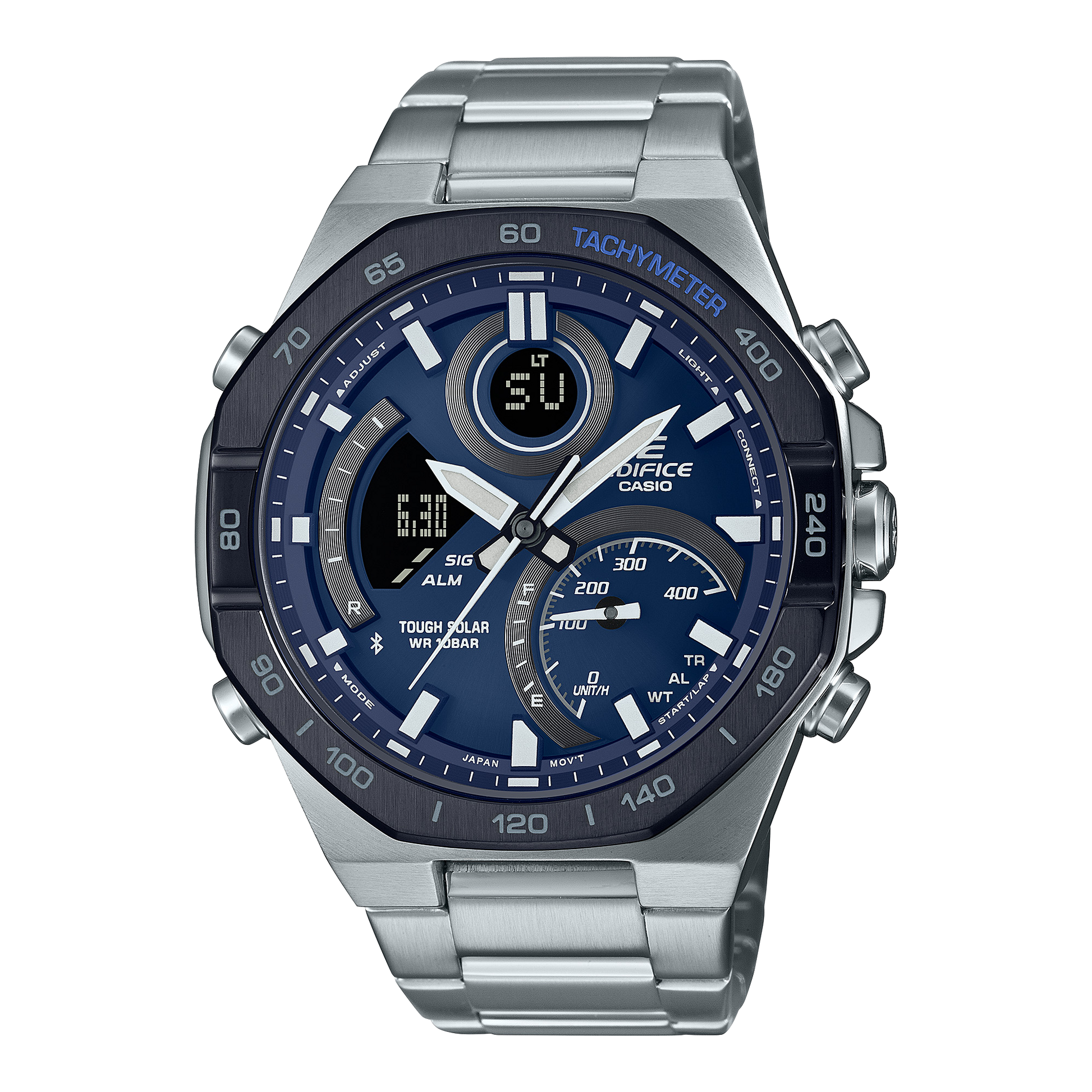 Get smartphone connectivity and so much more in an analog-digital combination EDIFICE timepiece, made to project speed and intelligence. The bold, sophisticated design features an octagonal bezel that evokes the lines of a race car mechanic’s tools. More than just an eye catcher, this watch delivers full-on functionality so you can get all the information you need on the easy-read hands and LCD. Sync with your smartphone via Bluetooth® for precision timekeeping, wherever you go. Simply tap on the app to effortlessly manage functions like selecting a city from the World Time list. The large inset dial at the 4 o’clock position boasts a speed indicator that displays average speeds when timing laps for set distances. The fully automatic LED light illuminates the dial and LCD with just a tilt of the wrist. Tough Solar charges the watch from sunlight or even fluorescent lamp light.