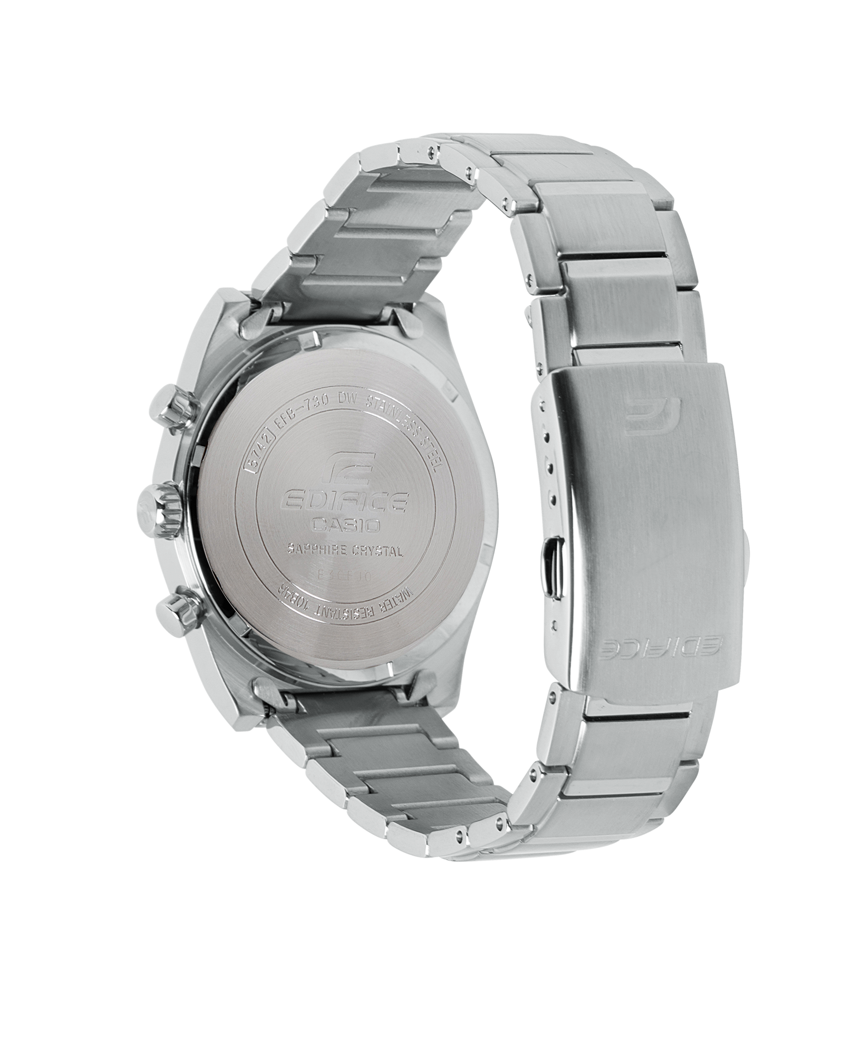 Introducing the EDIFICE motorsports chronograph inspired by the classic sportscar. Striking index bars join the legendary 3-6-9 inset dial layout in a time-honored sporty design. The smaller diameter of the case presents an elegant look of sheer speed. With sapphire crystal, stainless-steel case, and substantial stainless-steel band, this timepiece is water resistant up to 10 bars. This sporty, classic chronograph takes you from casual settings to business meetings in a split second.