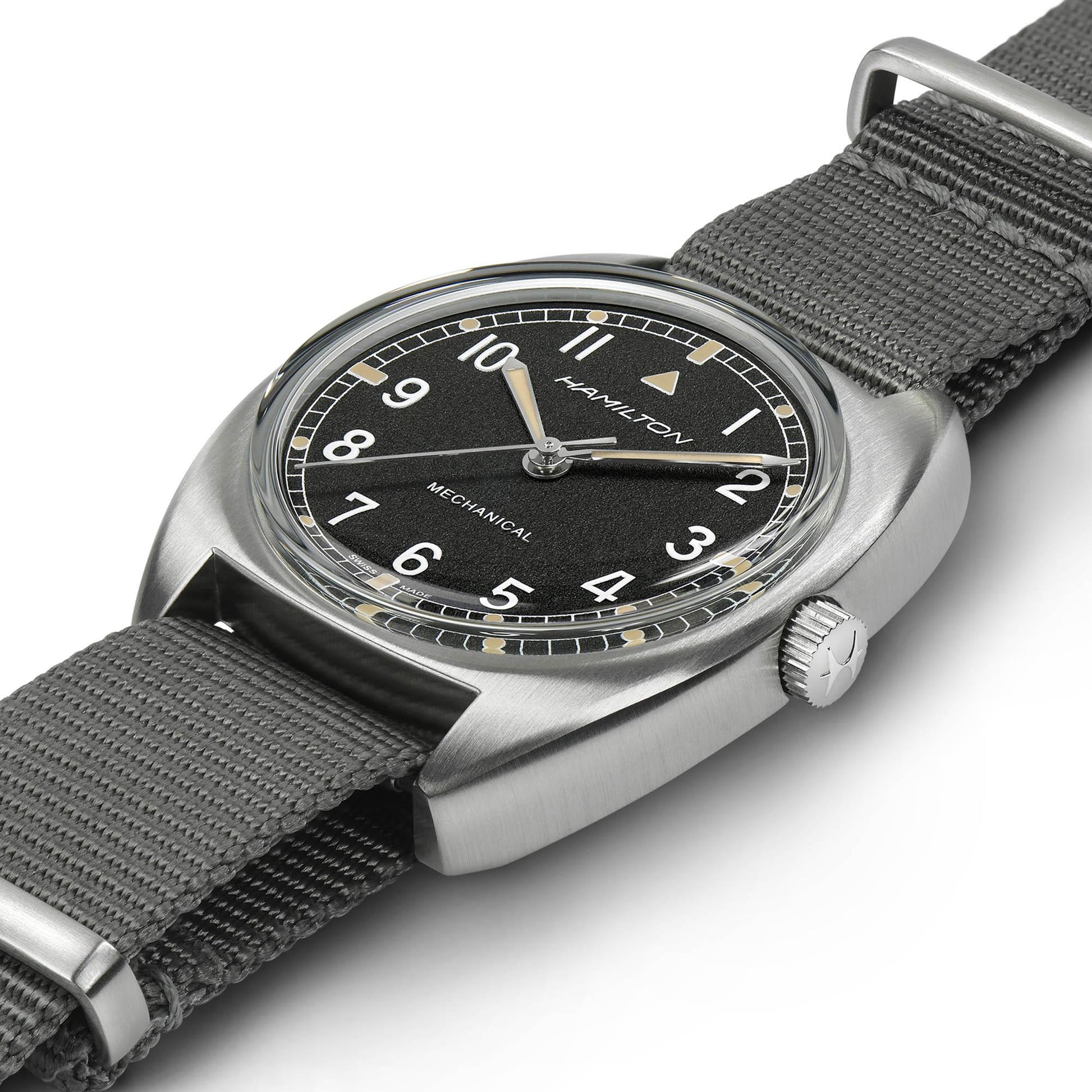 Powered by the awesome H-50 handwinding movement with 80 hours of power reserve, the Khaki Pilot Pioneer is a reinterpretation of a vintage military watch produced for the British Royal Air Force in 1973. Featuring a distinctive dial pattern and robust NATO strap, this is a military watch with real character.