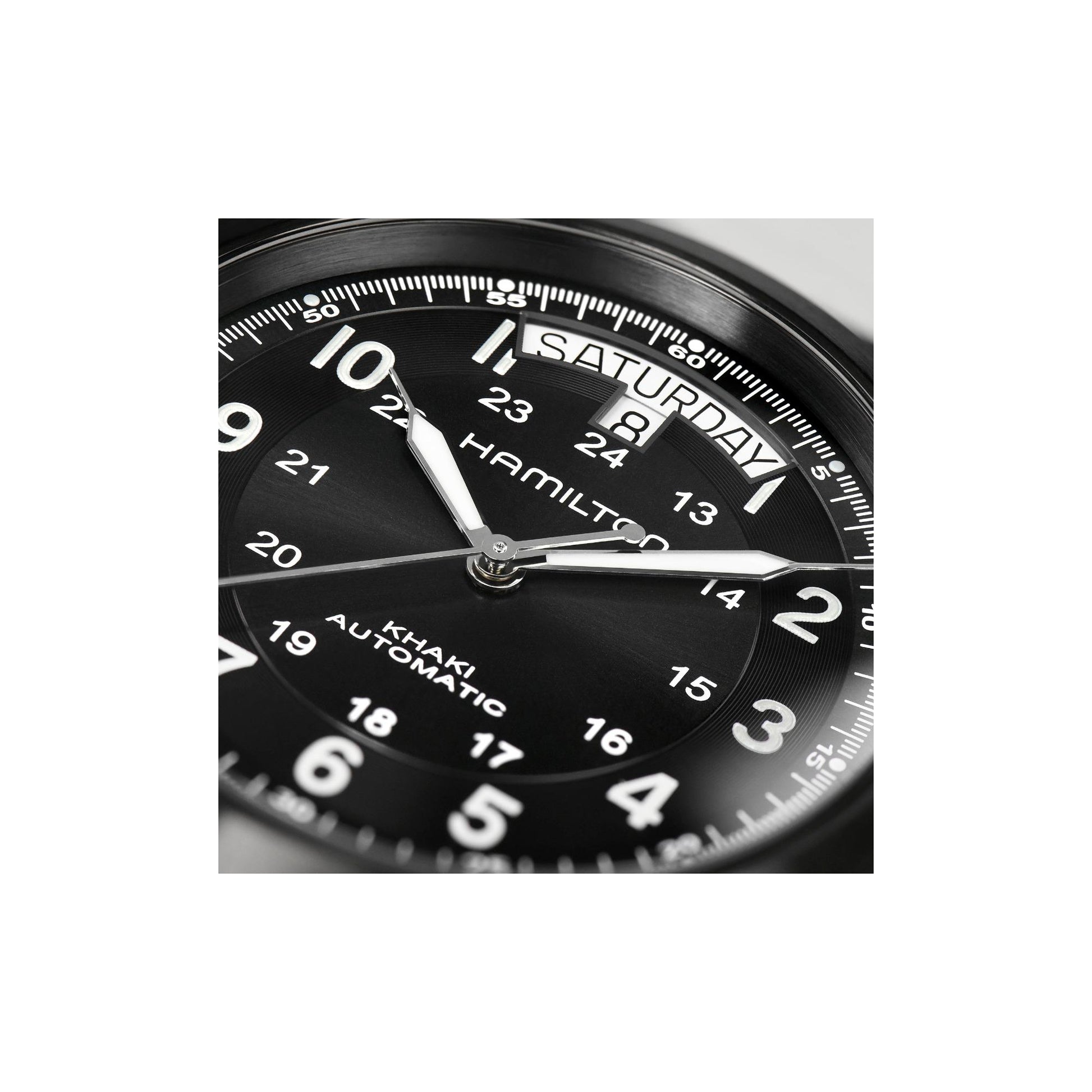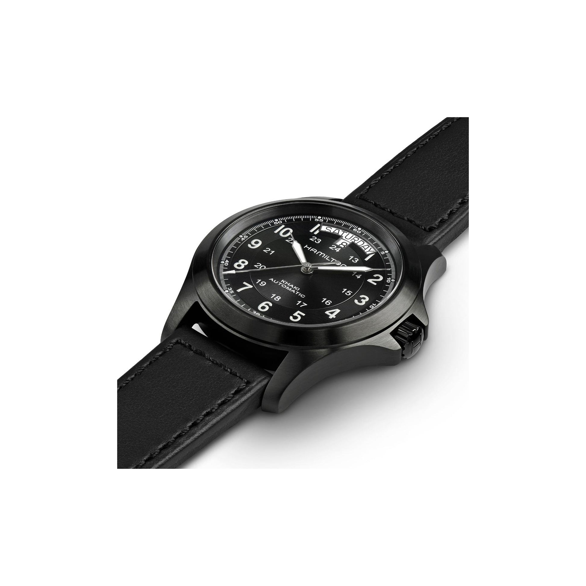 Inspired by Hamilton’s military heritage, our field watches are rugged and resilient. Perfect for after-dark heroics, the Khaki Field King Auto features a black PVD-coated case, black dial and black leather strap for the ultimate in stealth style.