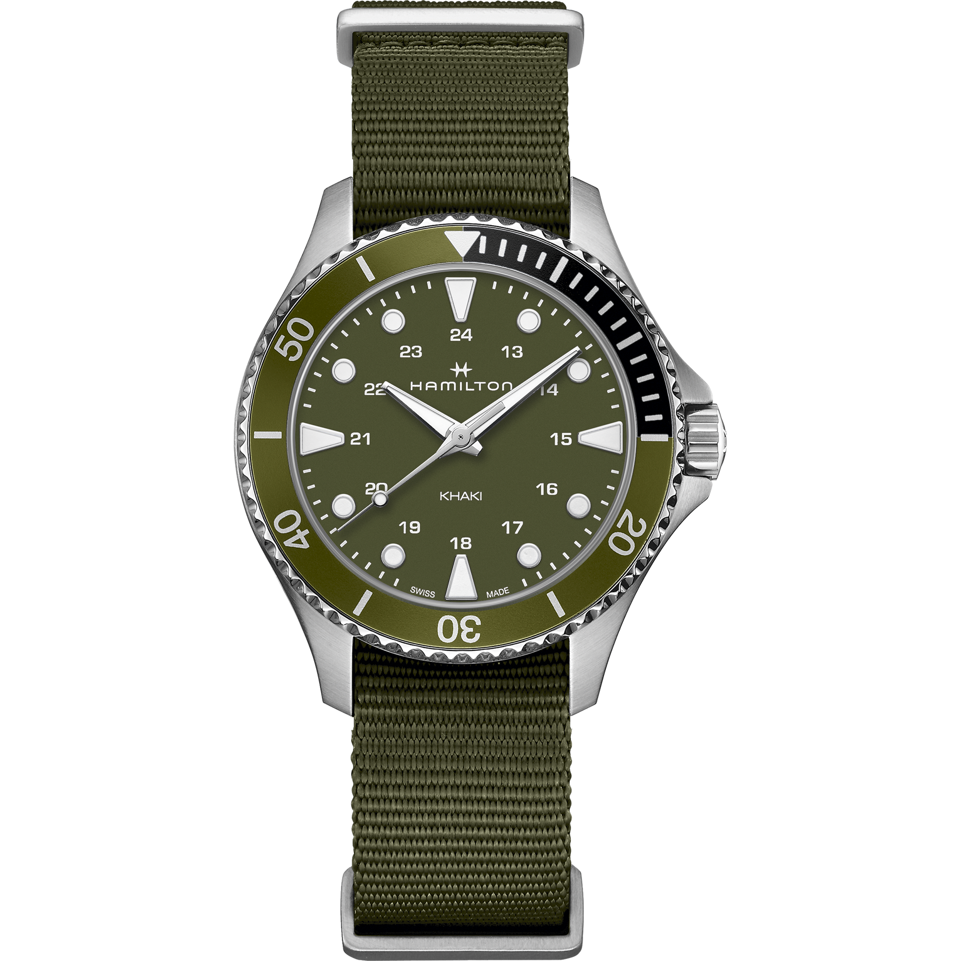 Sized to fit almost any wrist, the 37mm Khaki Navy Scuba Quartz features a total green look, with its unidirectional bezel made of aluminum, ultra-readable dial and a NATO textile strap. The hands and hour indexes on the deep military green dial are treated with Super-LumiNova® for optimal legibility. Appealing and ubiquitous, the green colorway adds an edge to the Khaki Navy Scuba, making it a timeless companion for any challenge, from aquatic explorations to urban adventures.