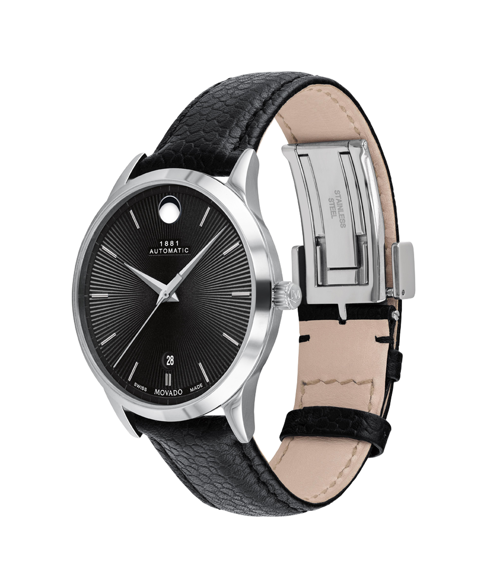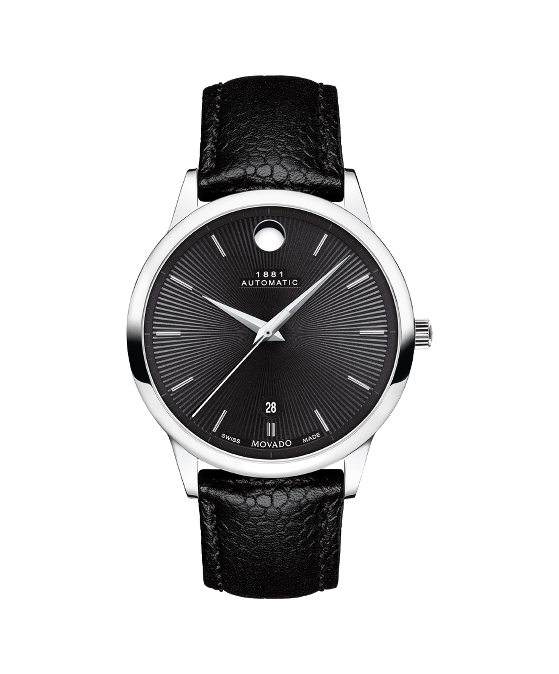 Movado 1881 Automatic, 40mm stainless steel case with black textured dial and black calfskin leather strap. Caseback features an Exposed Automatic Movement. Automatic watches do not contain batteries. They are charged by the movement of your wrist.