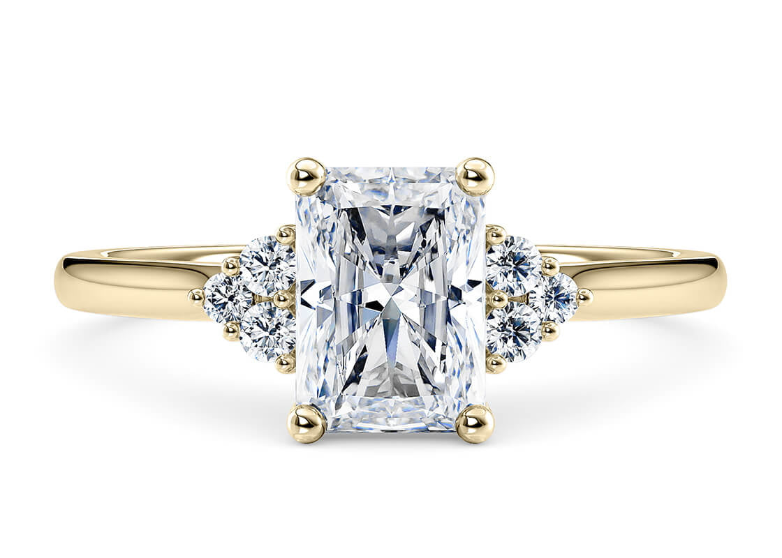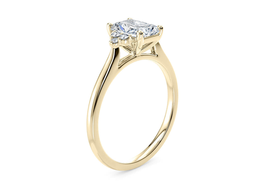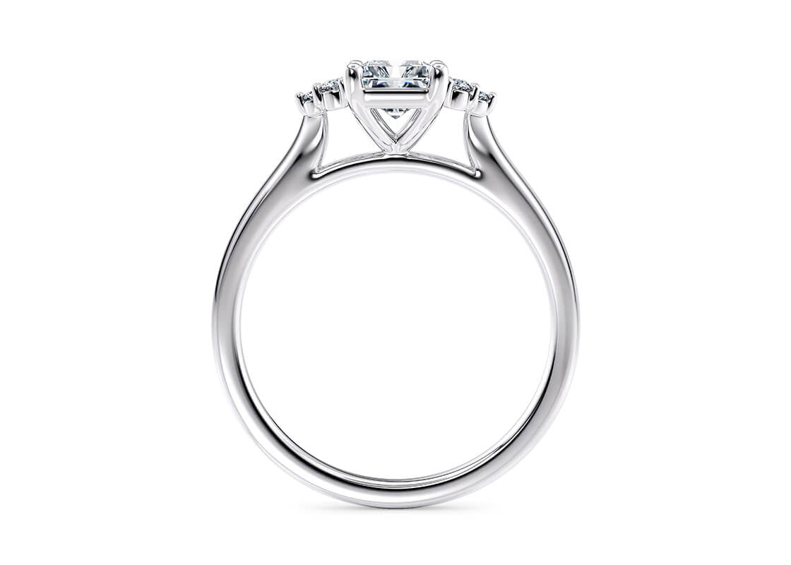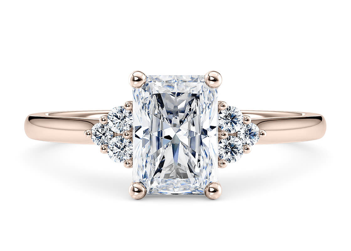 A flourish of brilliance, see in Rosa the delicate petals of Spring. A trilogy of small round diamonds are placed on either side of the central stone, mimicking Edwardian design. The open collet lets light pass through the central gem, for a glittering finish
