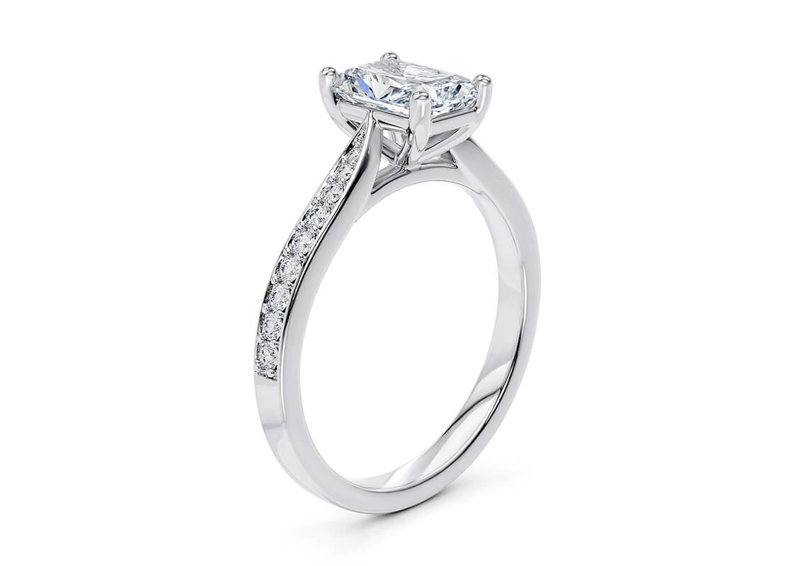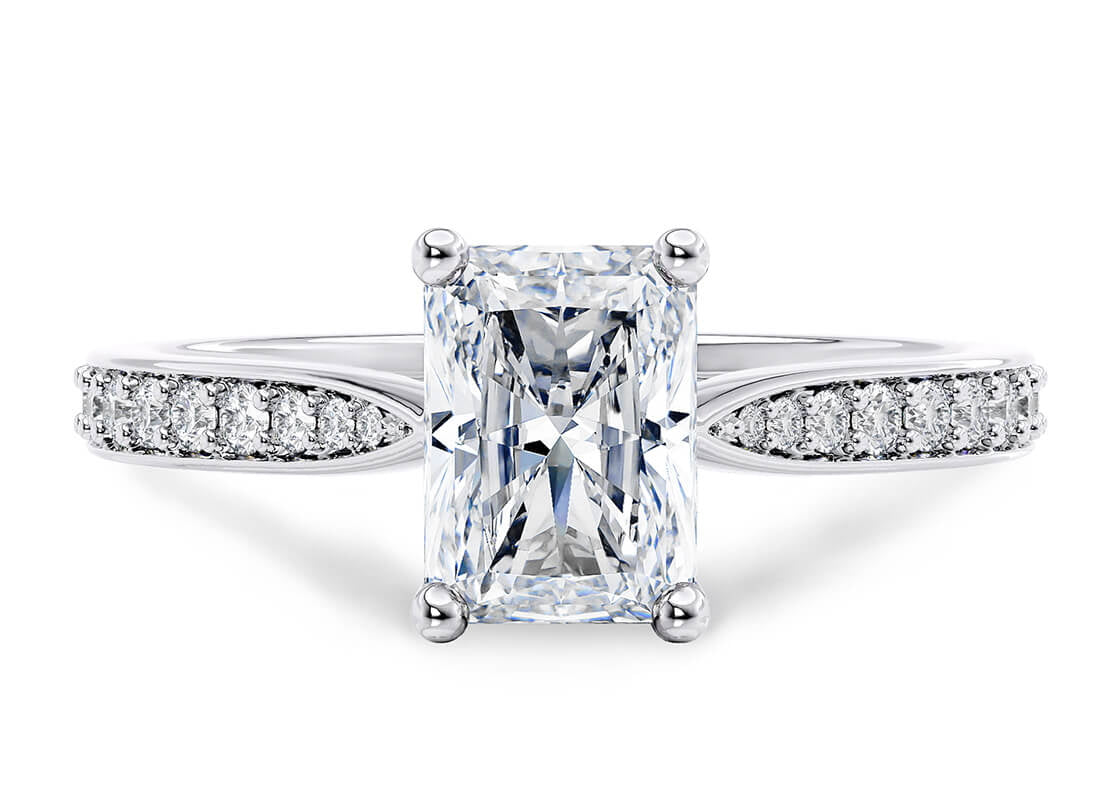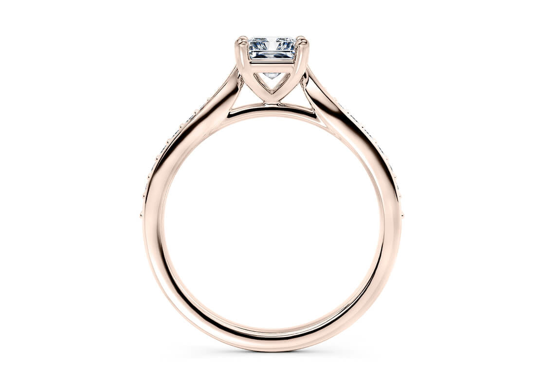 The Victoria ring offers both grace and captivating style. Featuring a thread set band with round brilliant diamonds, its gentle taper magnifies the elegance of any stone that crowns its centre.